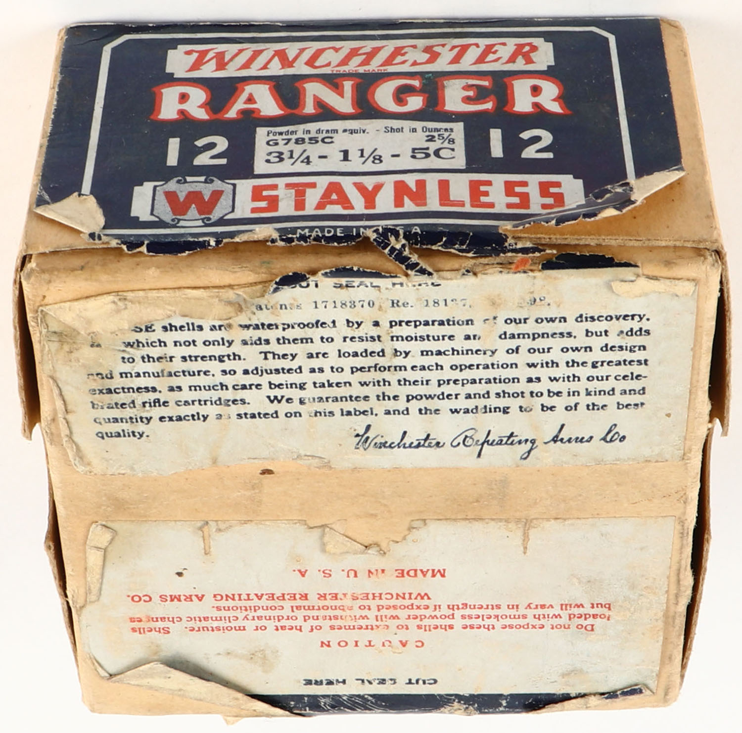 Winchester, Ranger, STAYNLESS, 12ga., 2pc., Partial 23 rds., shot size 5C, buff box with blue, red & white label, box is solid with scuffing to label, paper shells are very good. Grade: Very Good ++ - Value: 40 to 150