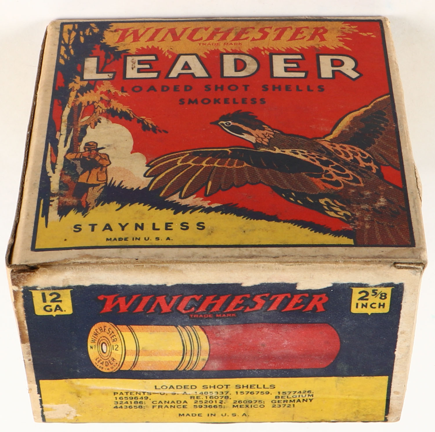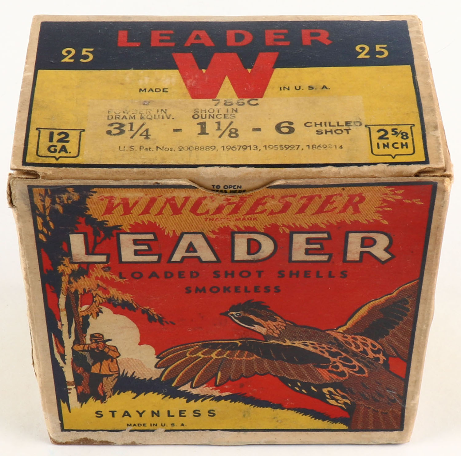 Winchester, LEADER QUAIL BOX, 12ga., 1pc., Full, shot size 6 CH, 2 5/8'', multi colored box with flying Quail & hunter in background, box is very solid with excellent color, has light edge wear, shells are excellent. Grade: Excellent - Value: 500 to 1500