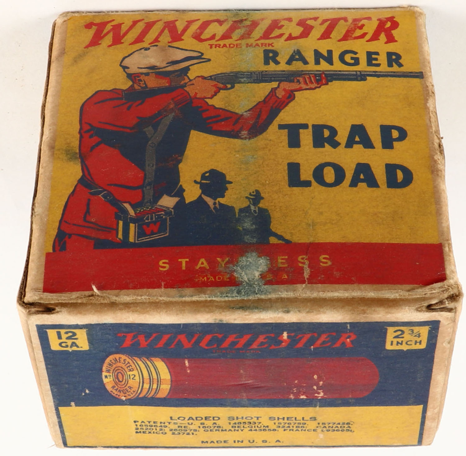 Winchester, Ranger TRAP LOAD, U.S. Property, 12ga., 1pc., Partial 23rds., shot size 8 Chilled Shot, yellow, blue & red box that pictures trap shooter, Box has age soiling, light shell protrusions, with very nice colors, shells are very good. Grade: Very Good + - Value: 40 to 200