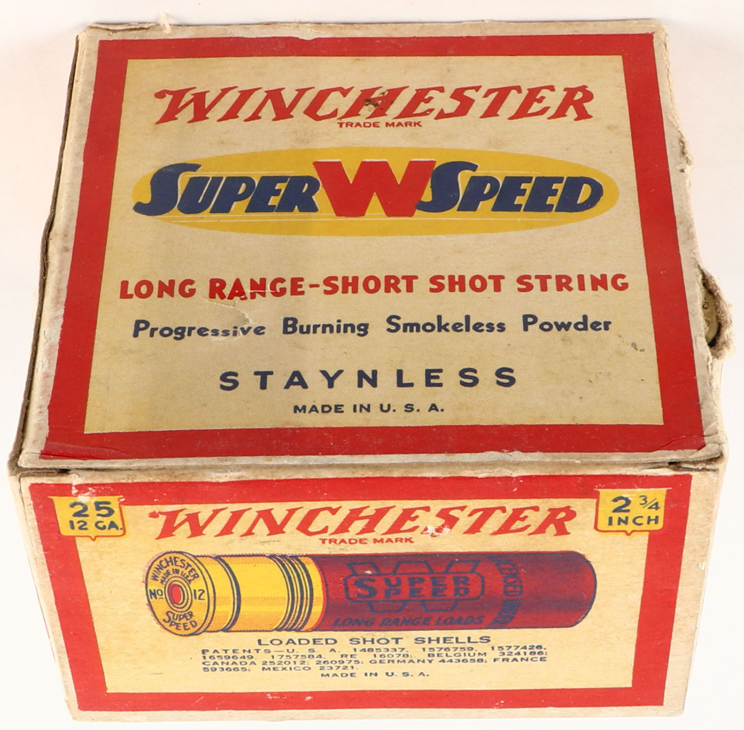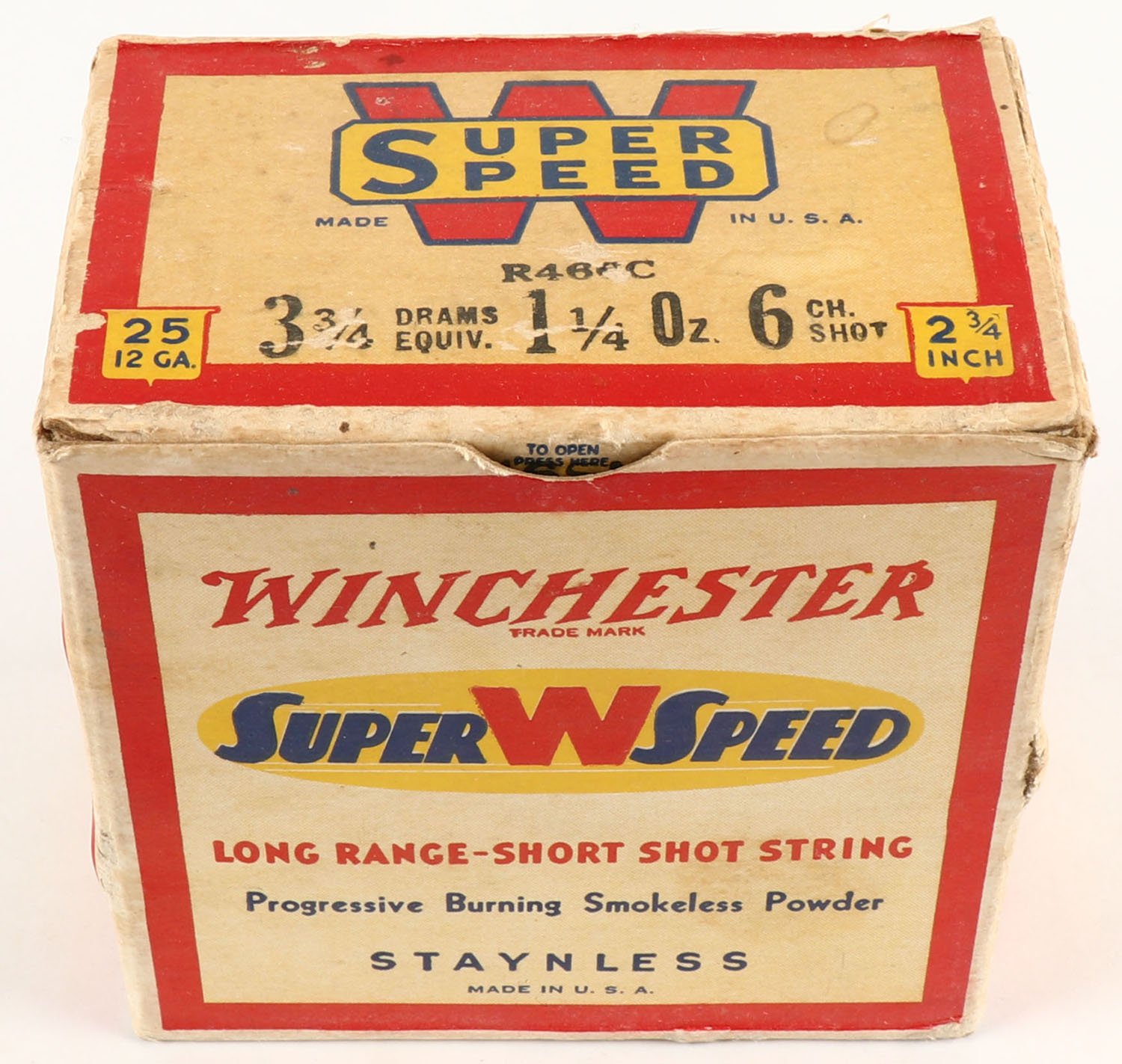 Winchester, Super W Speed, Staynless, 12ga., 2 3/4'', 1pc., Full, shot size 6 CH, cream red, blue and yellow box, box is solid with nice colors, box has light shell protrusion & light scuffing, shells are excellent. Grade: Very Good ++ - Value: 20 to 60