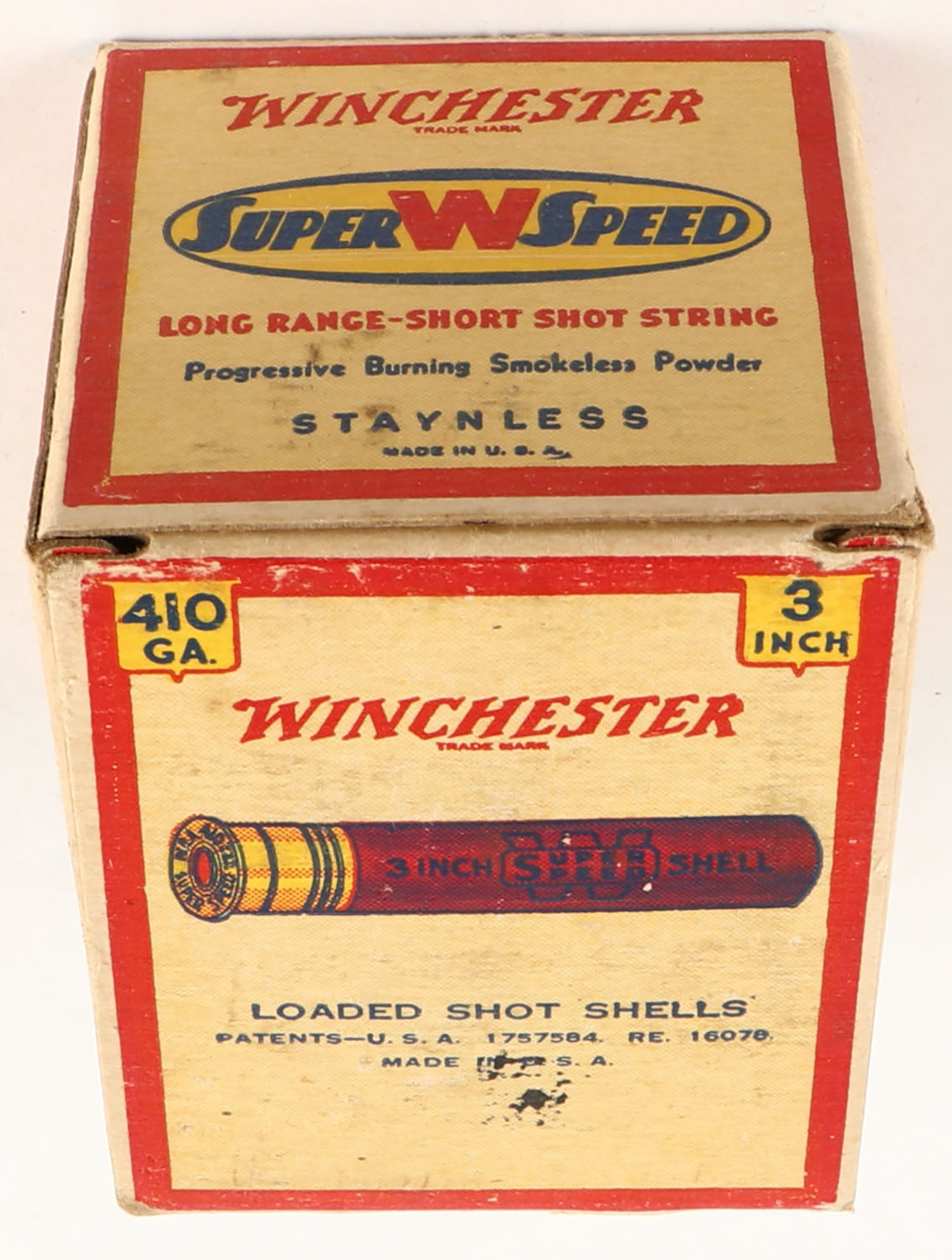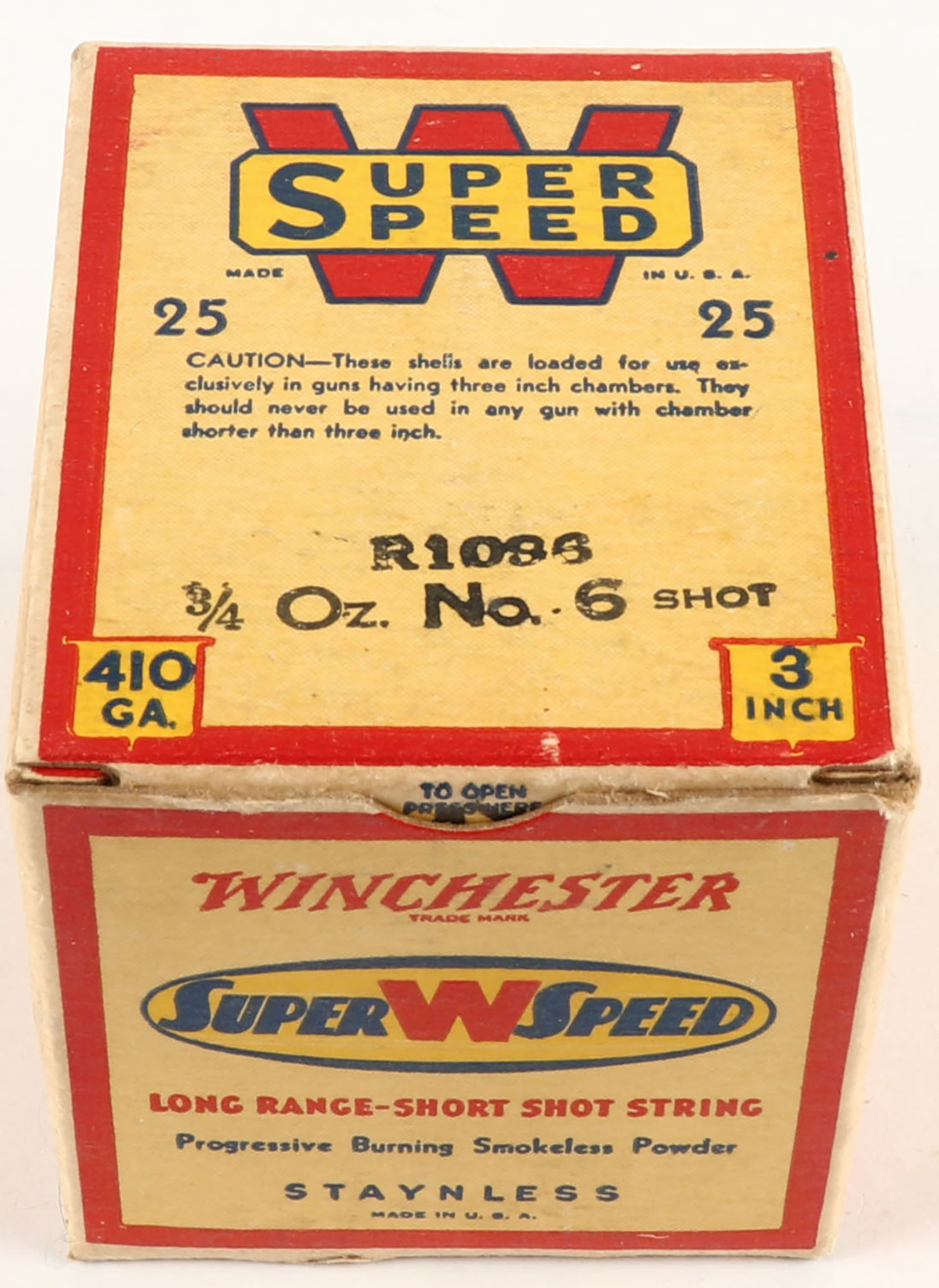 Winchester, Super W Speed, 410ga., Staynless, 3'', 1pc., Full, shot size 6, cream, red, blue and yellow box, box is very solid with great colors, paper shells are excellent. Grade: Excellent ++ - Value: 20 to 60