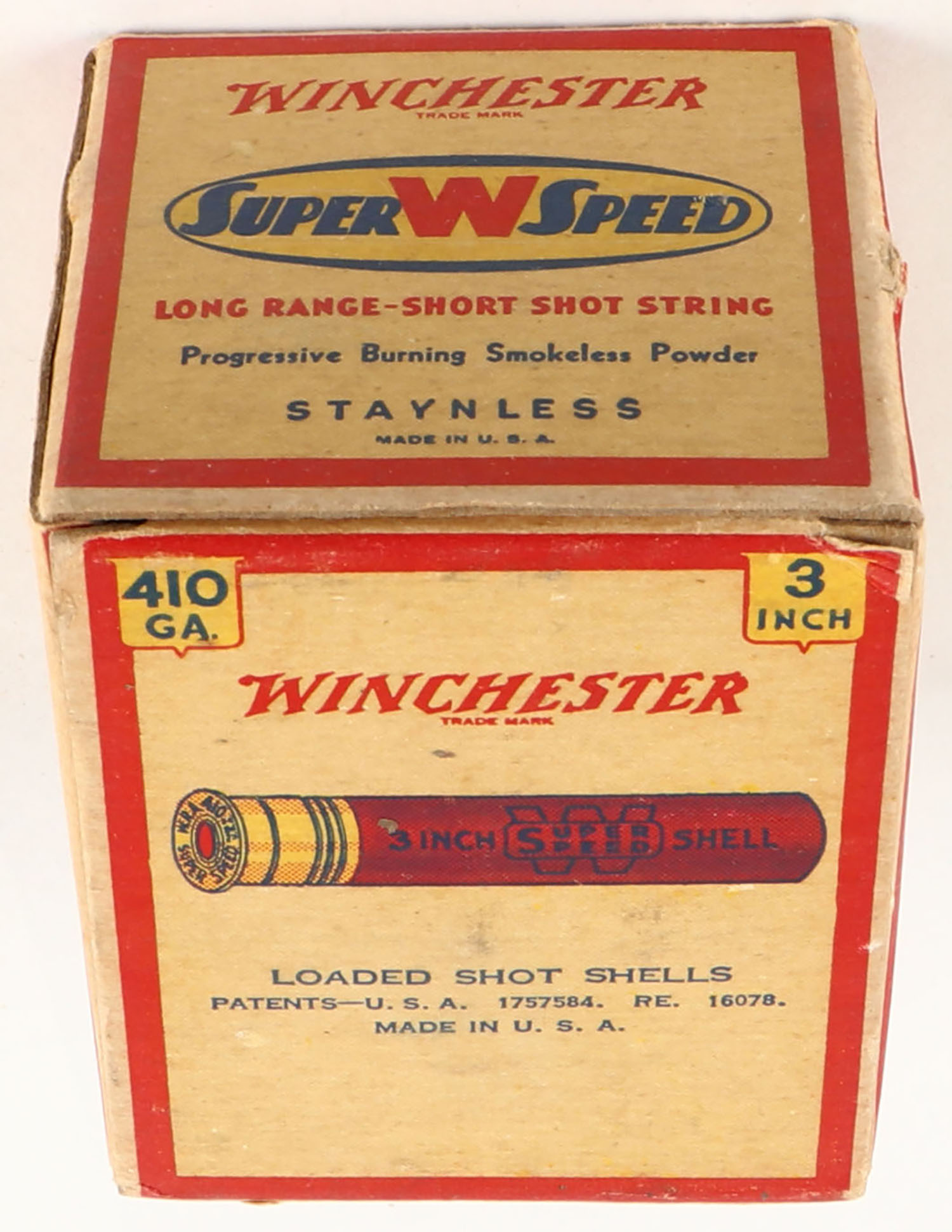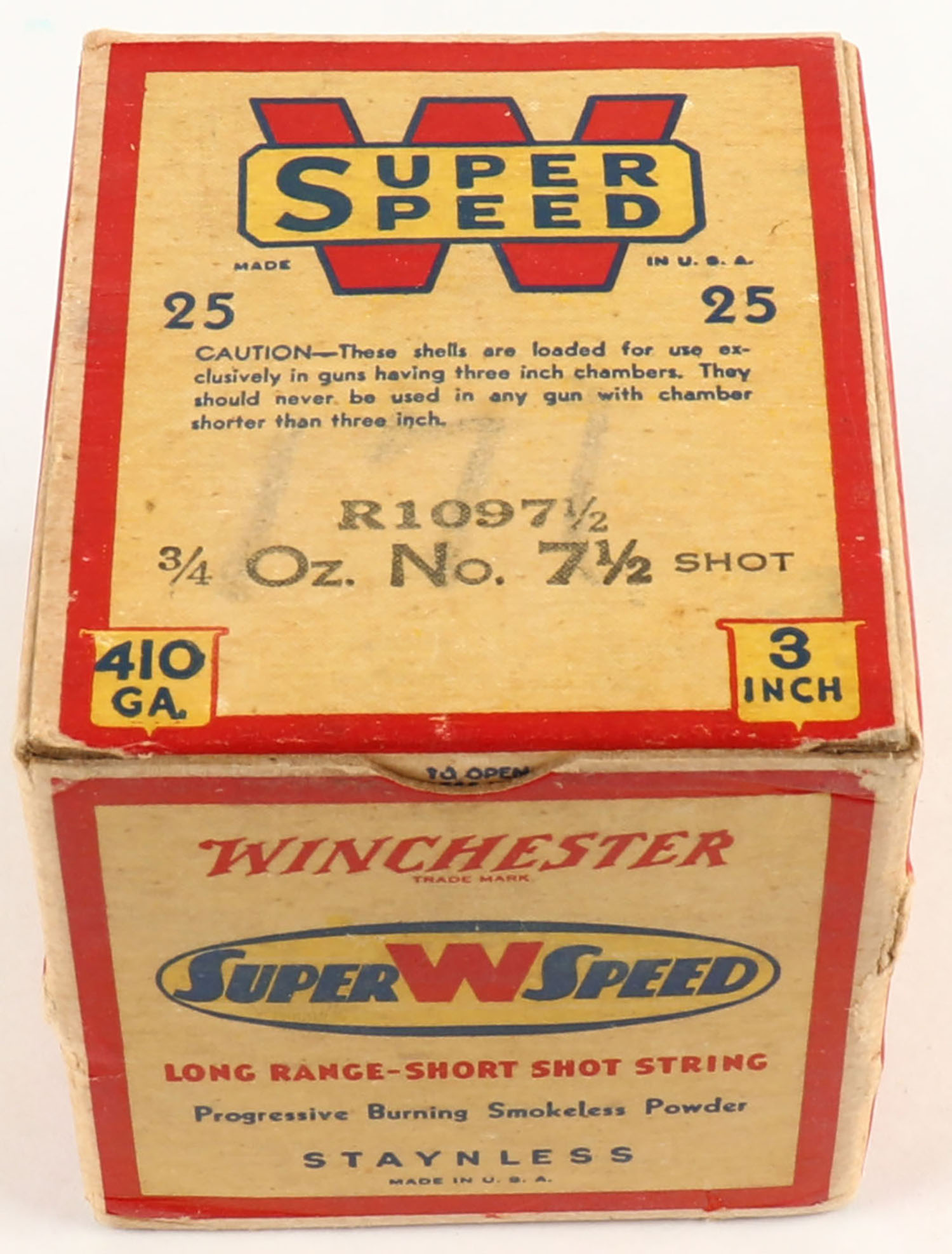 Winchester, Super W Speed, 410ga., Staynless, 3'', 1pc., Full, shot size 7 1/2, cream, red, blue and yellow box, box is very solid with great colors, has light age soiling, paper shells are excellent. Grade: Excellent + - Value: 20 to 60