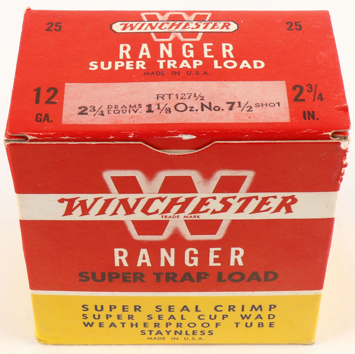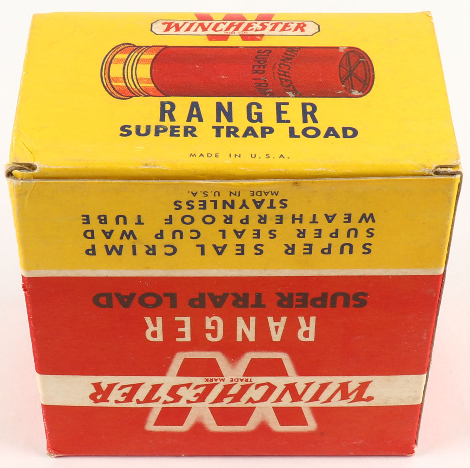 Winchester, Ranger Super Trap Load, 12ga., 1pc., Full, shot size 7 1/2, red, white & yellow box, Box is very solid with excellent colors, paper shells are minty. Grade: Excellent ++ - Value: 10 to 30