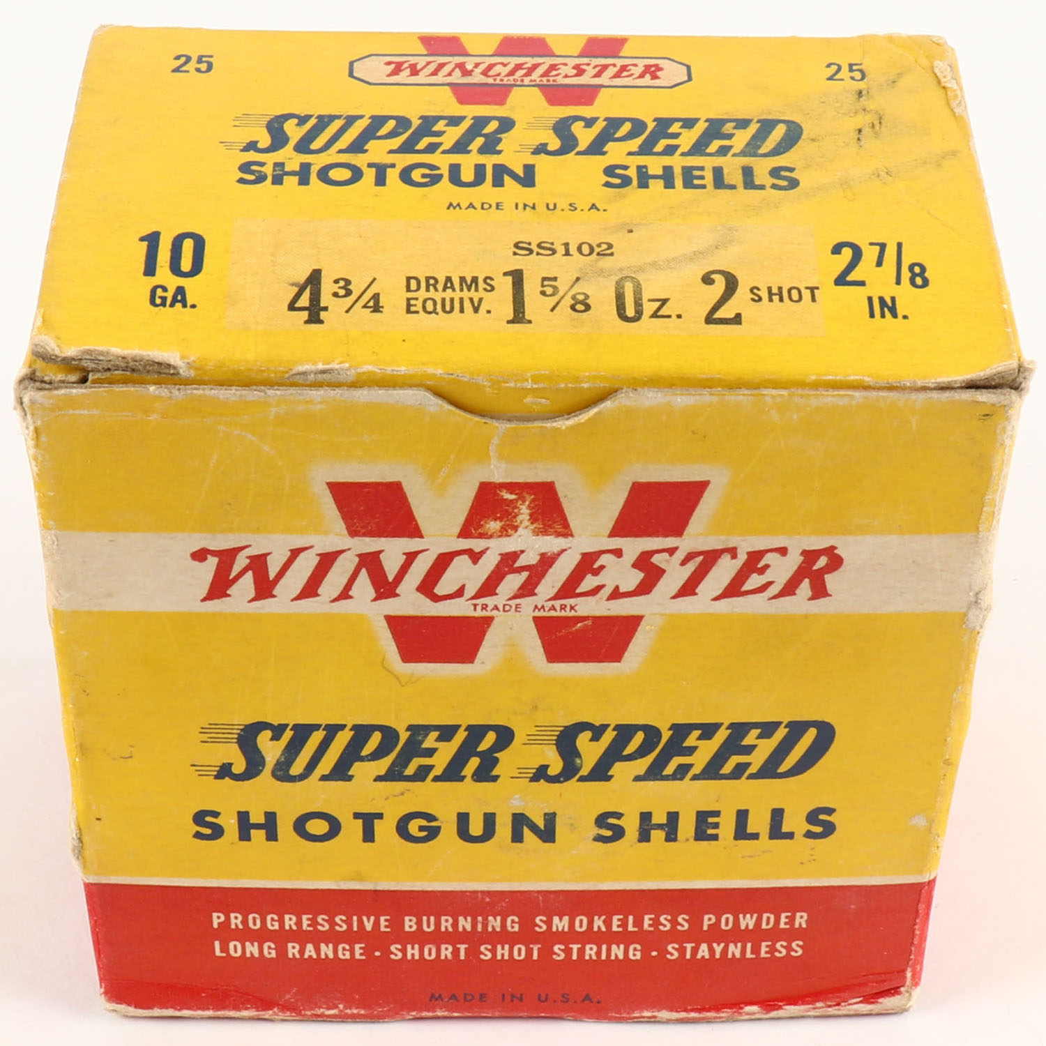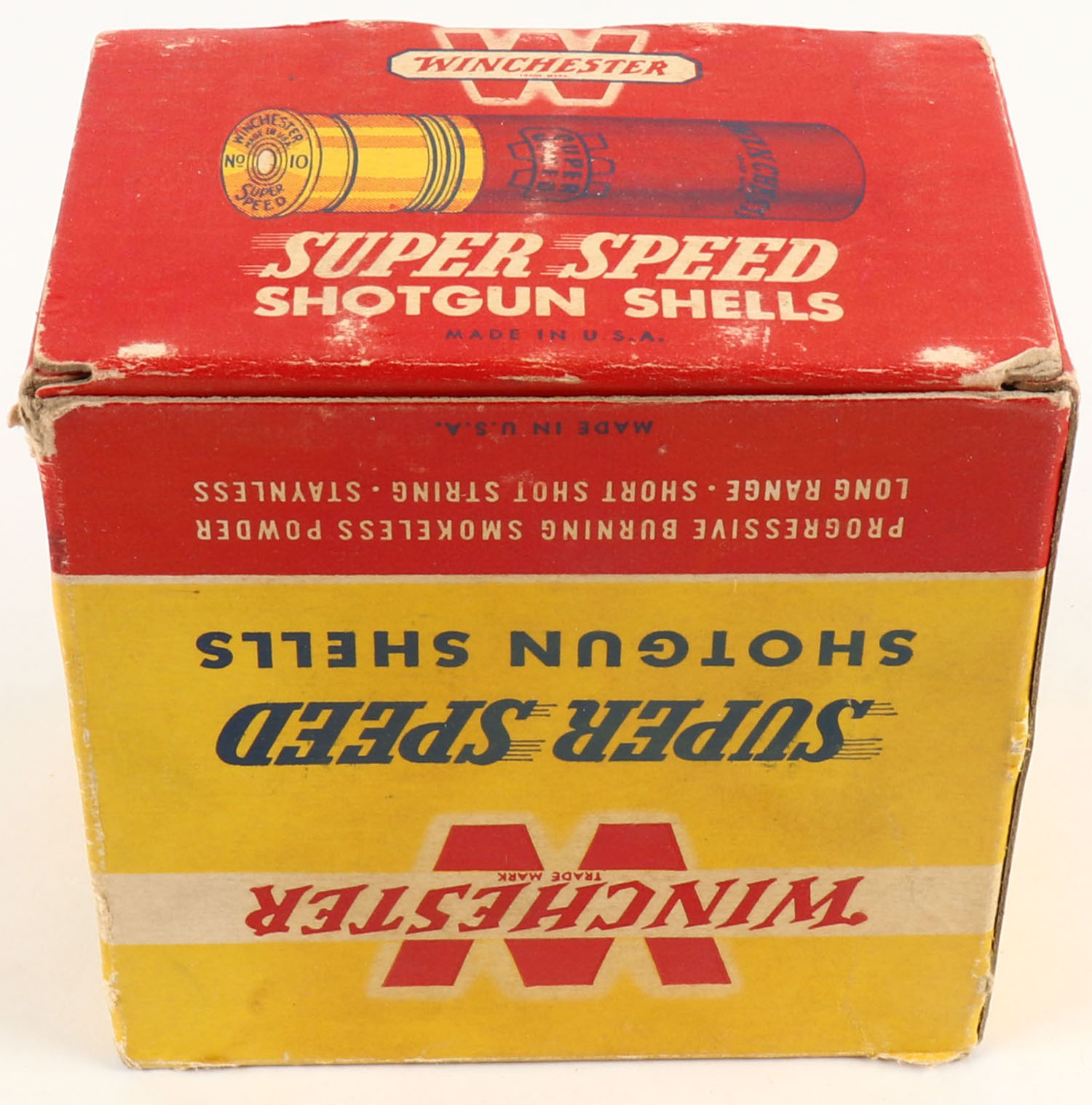 Winchester, Super Speed, 10ga., 2 7/8'', 1pc., Full, shot size 2, red, black and yellow box, box has light edge wear with great colors, paper shells are excellent. Grade: Very Good ++ - Value: 40 to 100