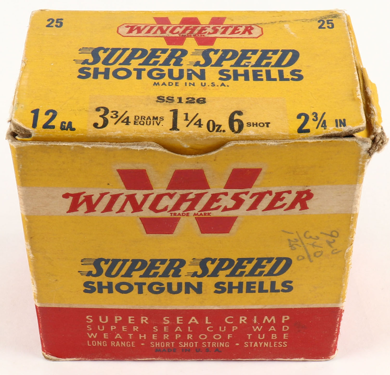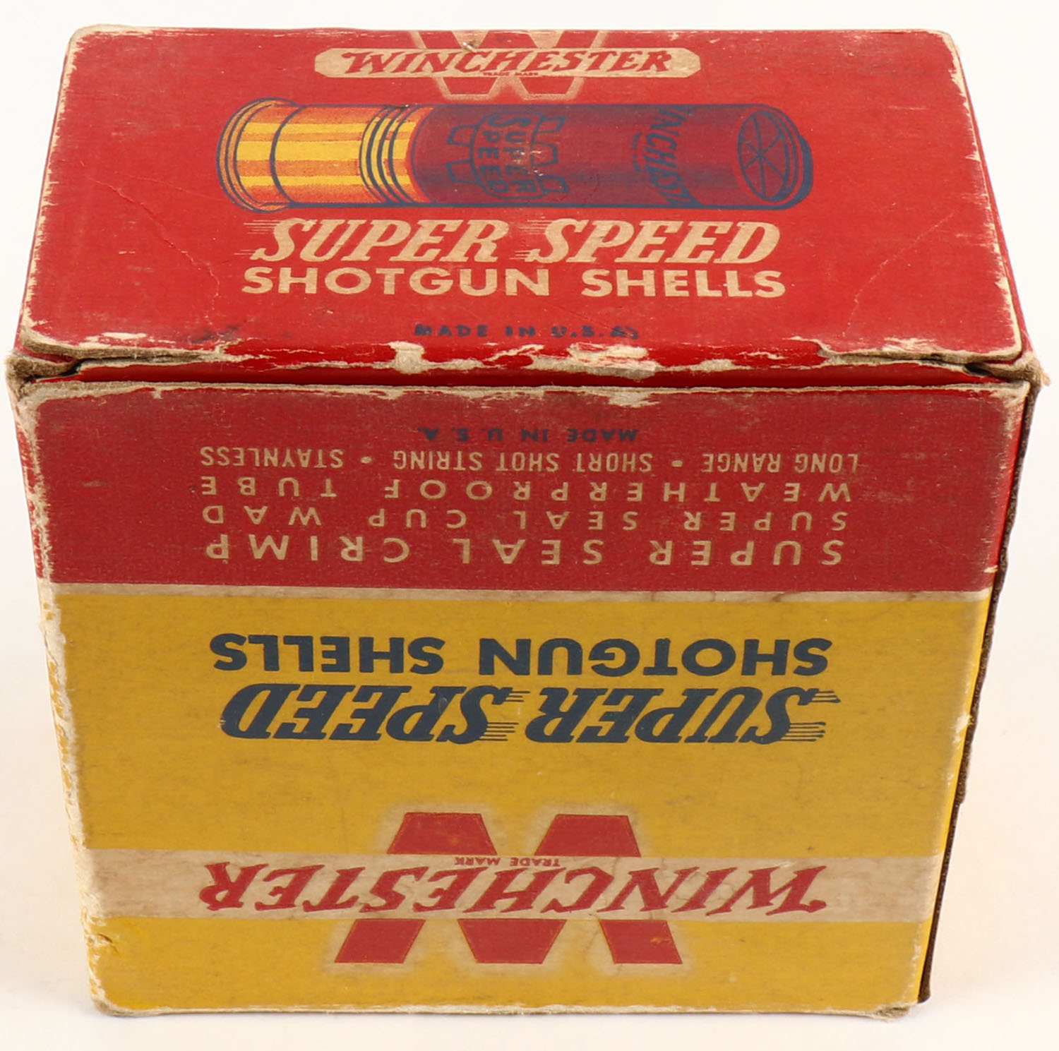 Winchester, Super Speed, 12ga., 2 3/4'', 1pc., Partial 20 rds, shot size 6, red, black and yellow box, box has edge wear with scuffing, paper shells are very good. Grade: Good ++ - Value: 10 to 30
