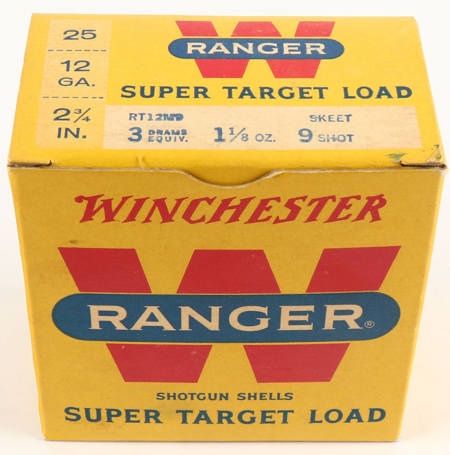Winchester, Ranger Super Target Load, 12ga., 1pc., Full, Shot size 9 Skeet, red, white, & yellow box, Boz is very solid with very nice colors, paper shells are excellent. Grade: MINT - Value: 20 to 60