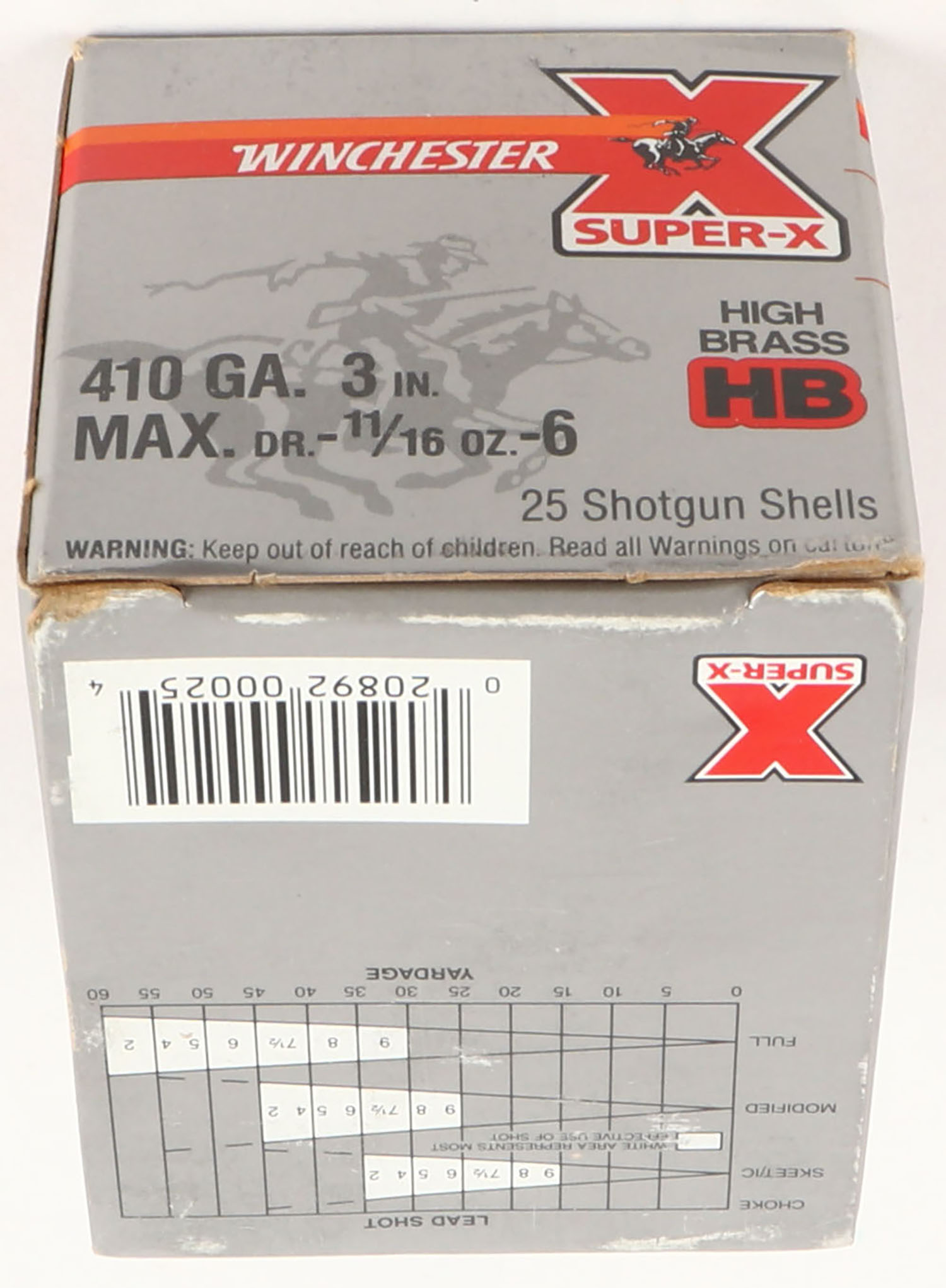 Winchester, Super-X High Brass, 410ga., 1pc., Full, shot size 6, box is solid with great color, plastic shells are excellent. Grade: Excellent - Value: 10 to 30