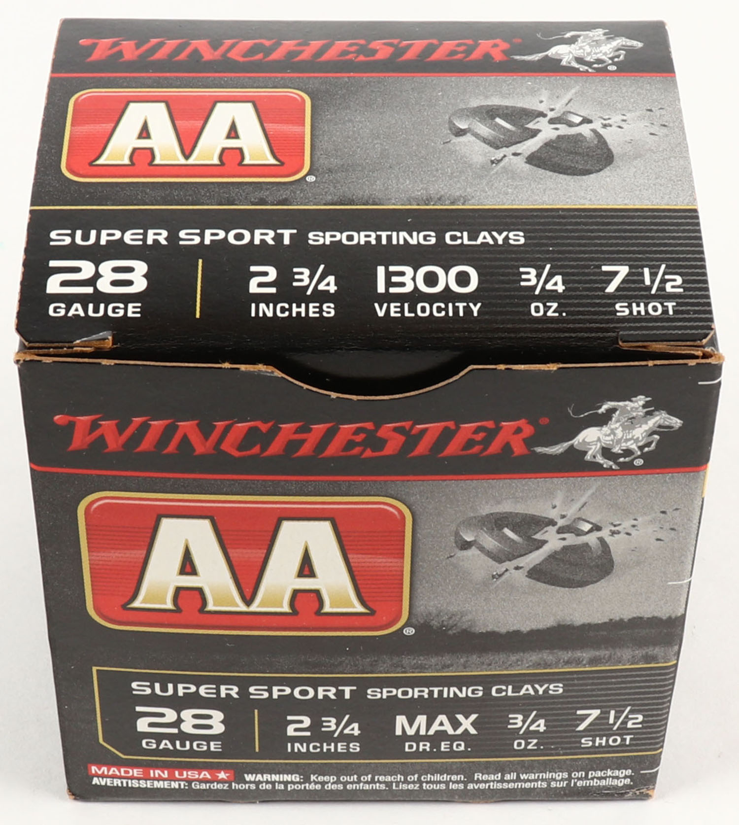 Winchester, AA, Super Sport, 28ga., 2 3/4'', 1pc., Full, Shot size 7 1/2, multi-colored box, box is very solid with great colors, plastic shells are excellent. Grade: Excellent ++ - Value: 10 to 30