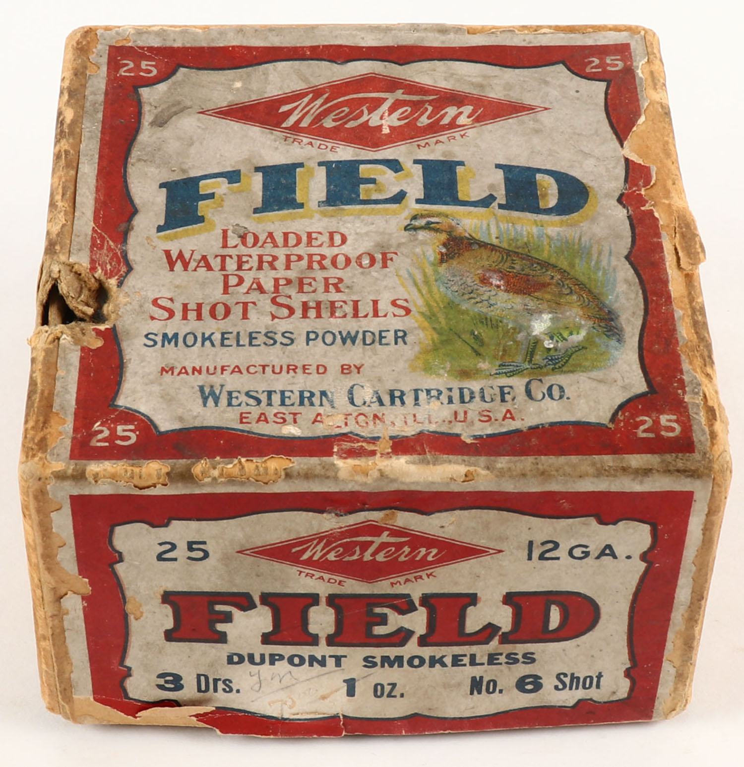 Western, Field, 12ga., 2pc, Empty, shot size 6, box has soiling & scuffing with edge wear.. Grade: Excellent - Value: 60 to 200