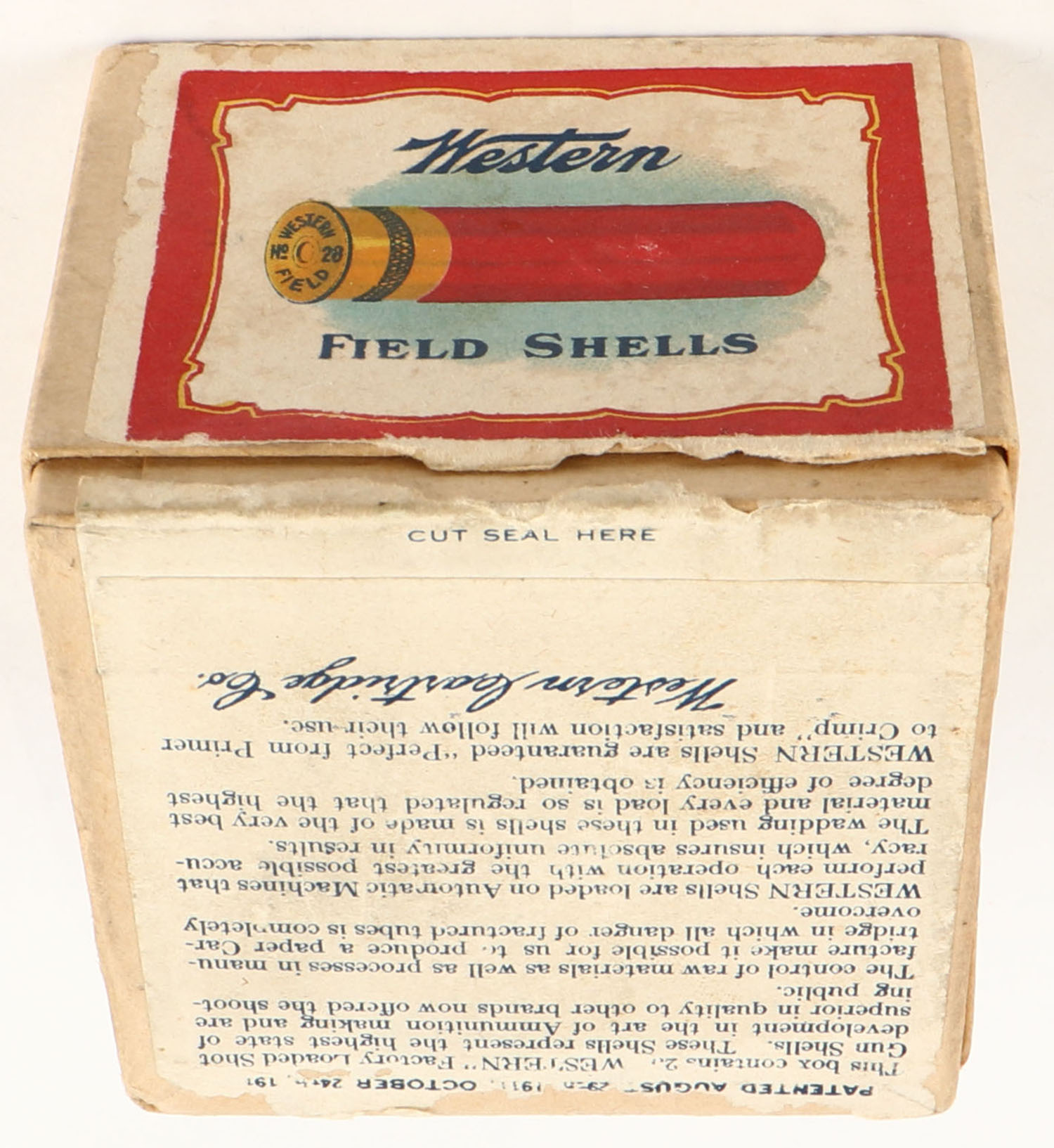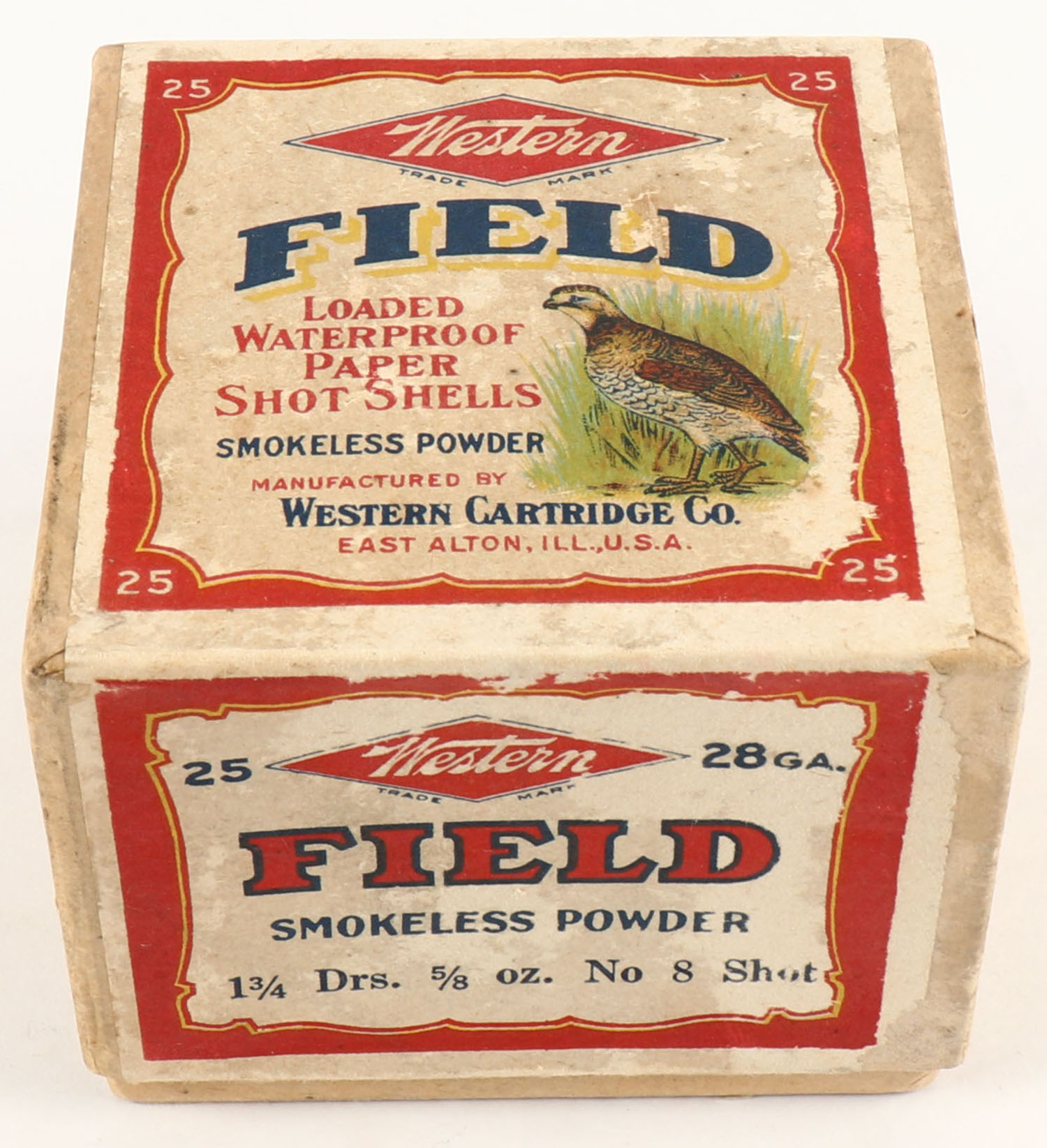 Western, Field, 28ga., 2pc, Full of Fired Primed Empties with one being unfired, shot size 8, box is very solid with great color to label, box has scuffing, shells are very good. Grade: Very Good ++ - Value: 50 to 300