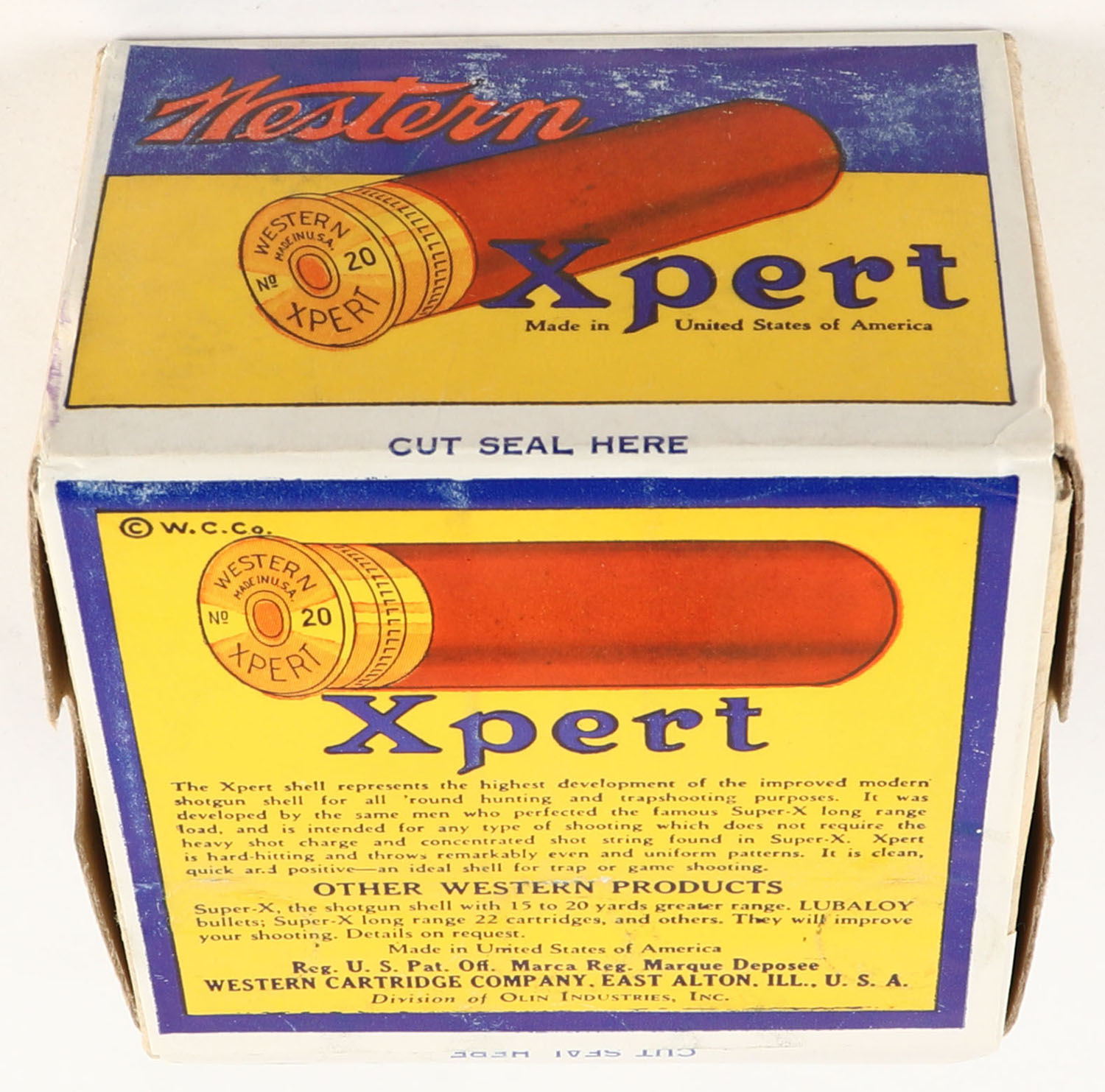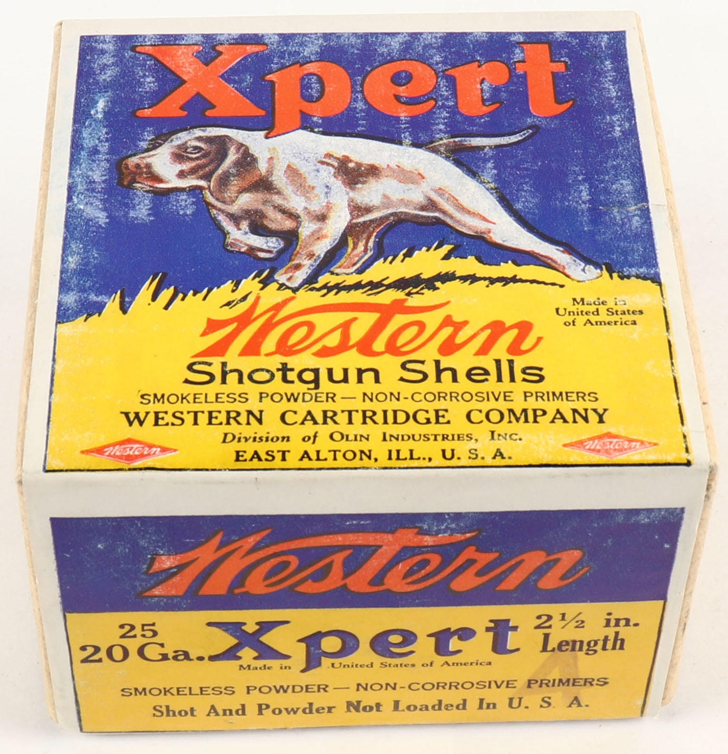 Western, Xpert, 20ga., 2pc., FULL and SEALED, shot size 7 1/2, buff box with blue and yellow paper label that pictures the pointer dog on top, box is very solid has light age soiling with great colors. Front of box says ''Shot and Powder Not Loaded In U.S.A'' but says ''Made In United States Of America'' on top of box, loaded in Mexico. Grade: Excellent ++ - Value: 50 to 200