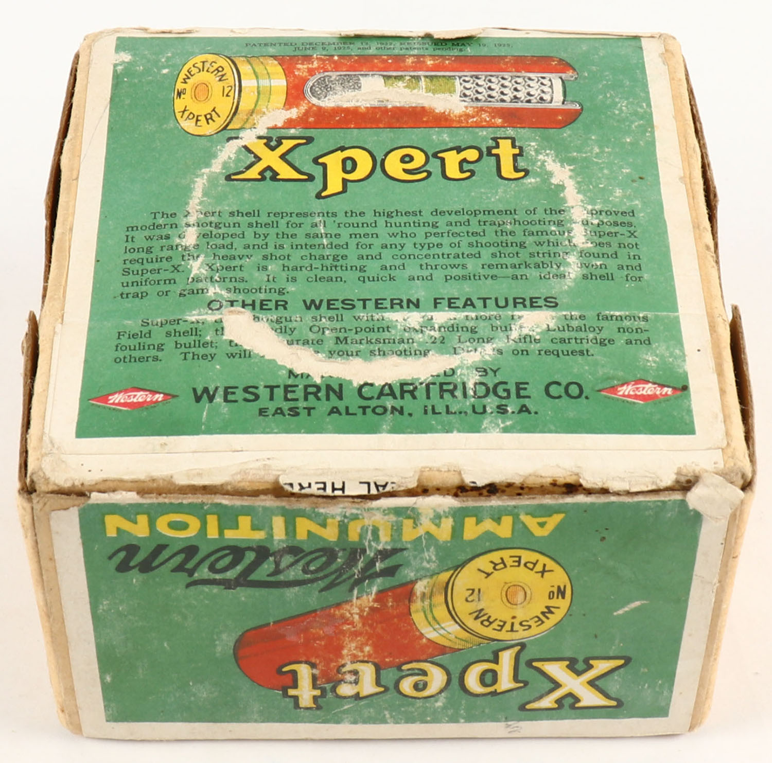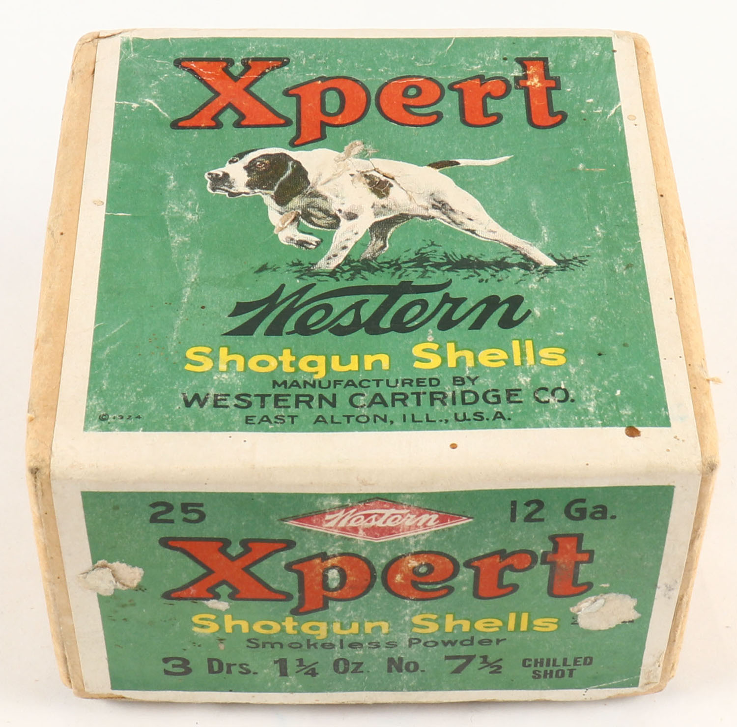 Western, Xpert, 12ga., 2pc., Empty, shot size 7 1/2 Chilled Shot, buff box with green paper label that pictures the pointer, box is solid with great colors to label and light age soiling. Grade: Excellent - Value: 200 to 500