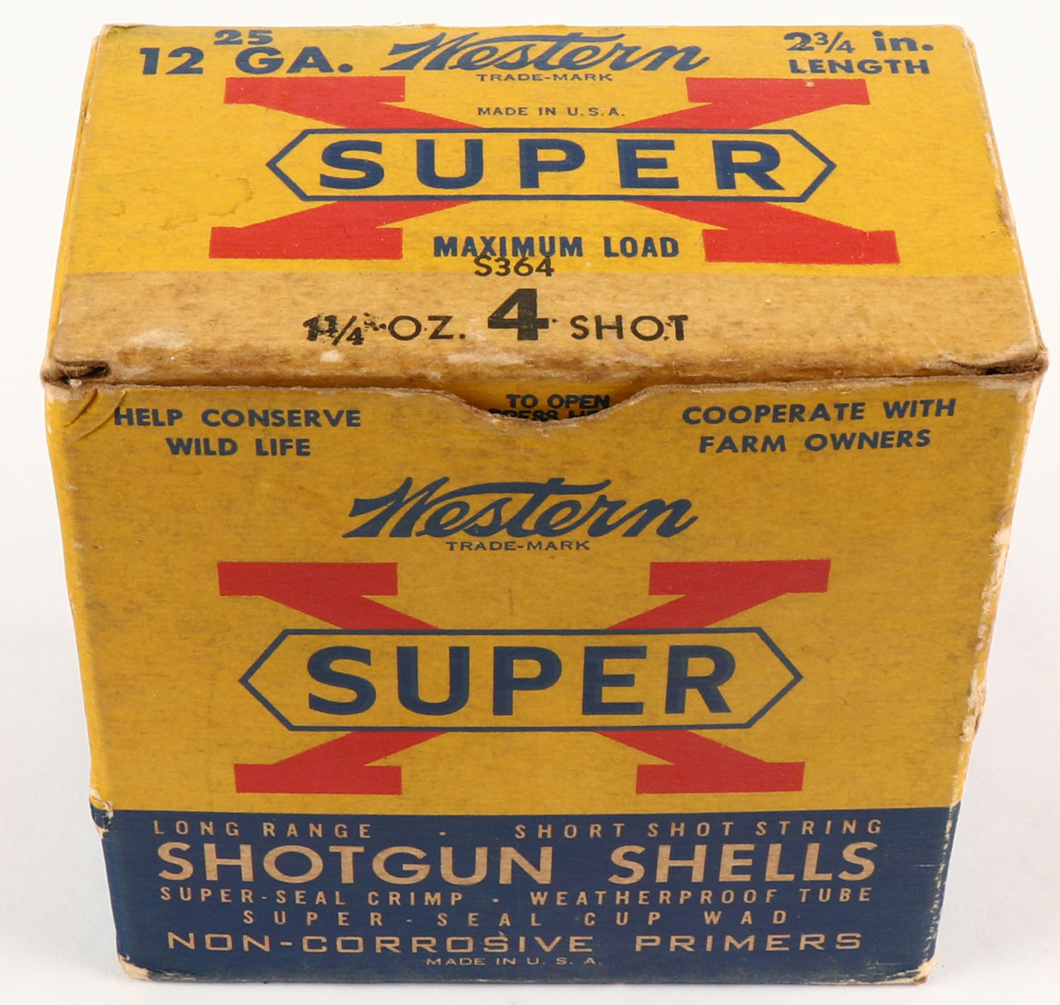 Western, Super X, 12ga., 1pc., Full, shot size 4, 2 3/4'', multi-colored box, box has light scuffing with great color, paper shells are excellent. Grade: Very Good ++ - Value: 10 to 30