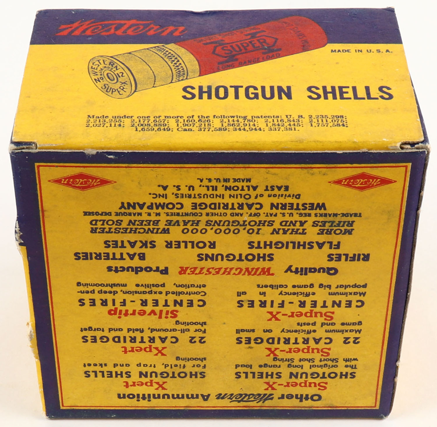 Western, Super X, 12ga., 1pc., Full, shot size 6, 2 3/4'', multi-colored box, box has light edge wear with very nice color, paper shells are excellent. Grade: Excellent - Value: 10 to 30