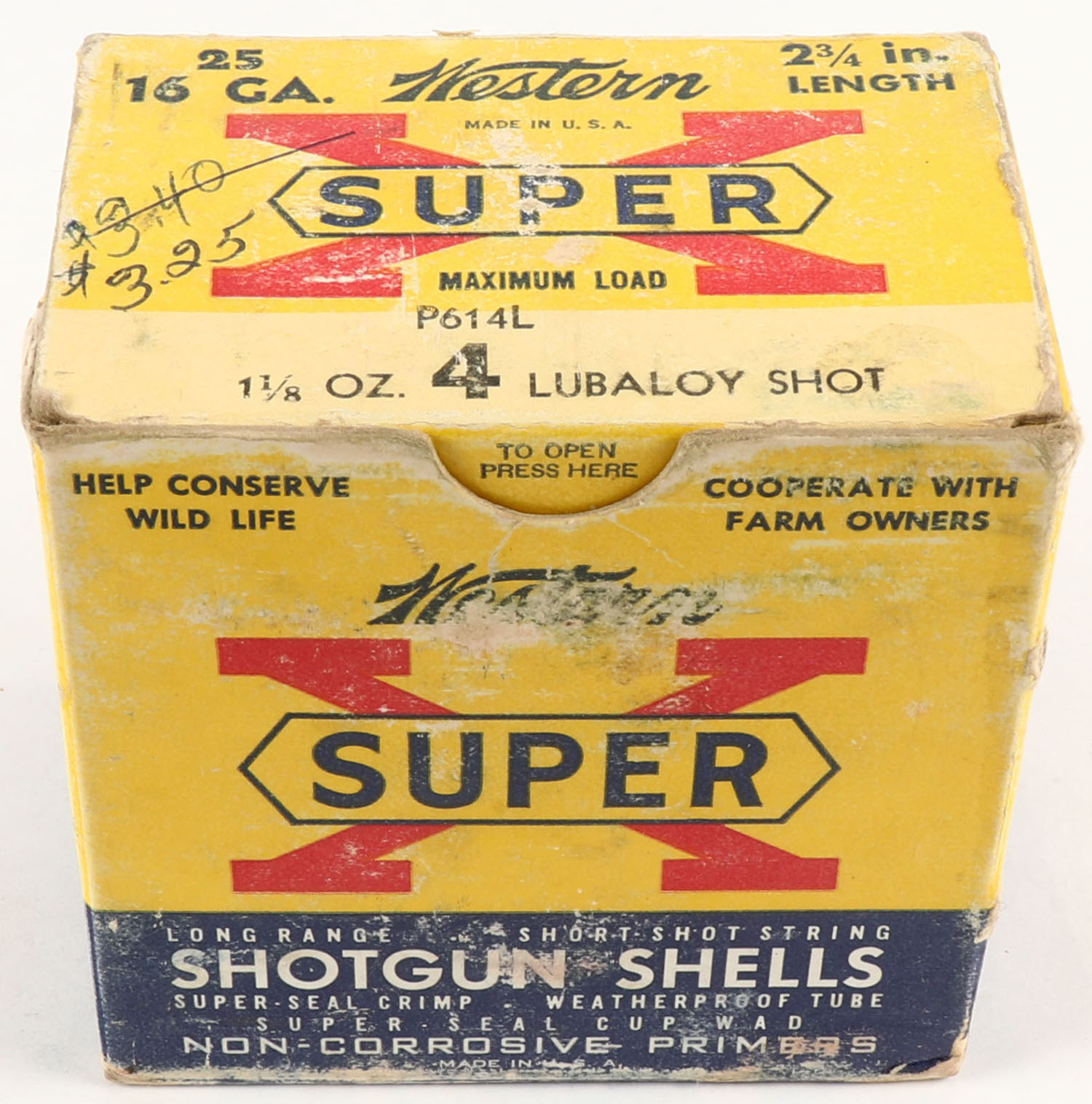 Western, Super X, 16ga., 1pc., Full, shot size 4 Lubaloy, 2 3/4'', multi-colored box, box has light scuffing & tear on top flap with great color, shells are excellent. Grade: Very Good ++ - Value: 10 to 30