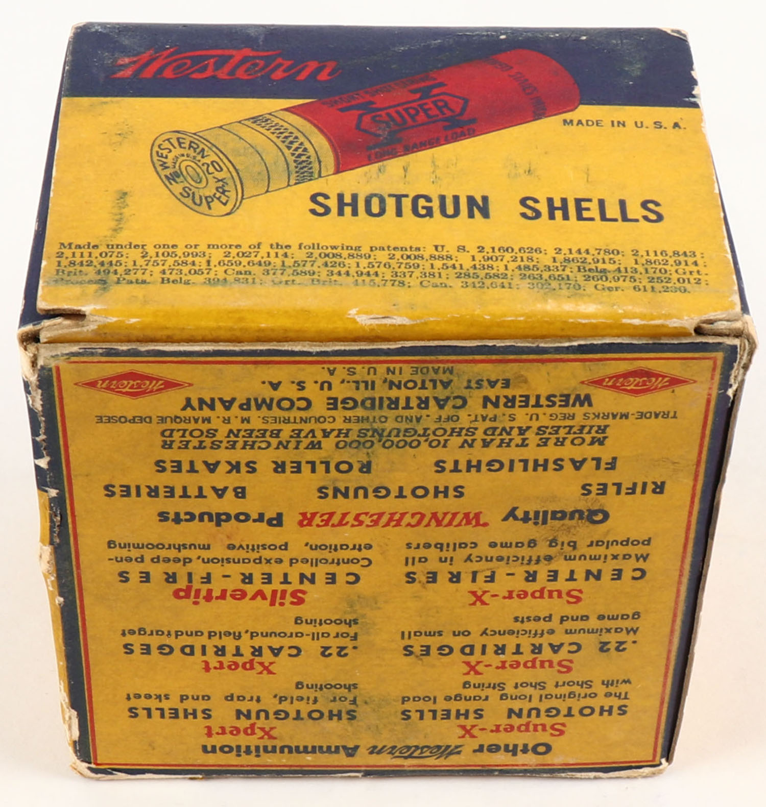 Western, Super X, 20ga., 2 3/4'', 1pc., Full, shot size 6CH, multi-colored box, box is solid with light age soiling, paper shells are excellent. Grade: Very Good ++ - Value: 10 to 30