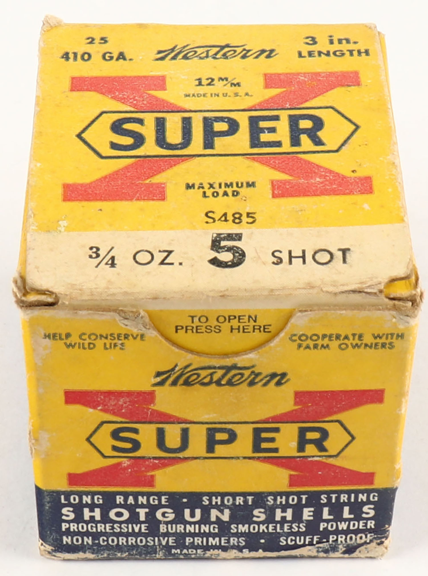 Western, Super X, 410ga., 3'', 1pc., Full, shot size 5, multi-colored box, box has light scuffing, paper shells are excellent. Grade: Very Good ++ - Value: 10 to 30