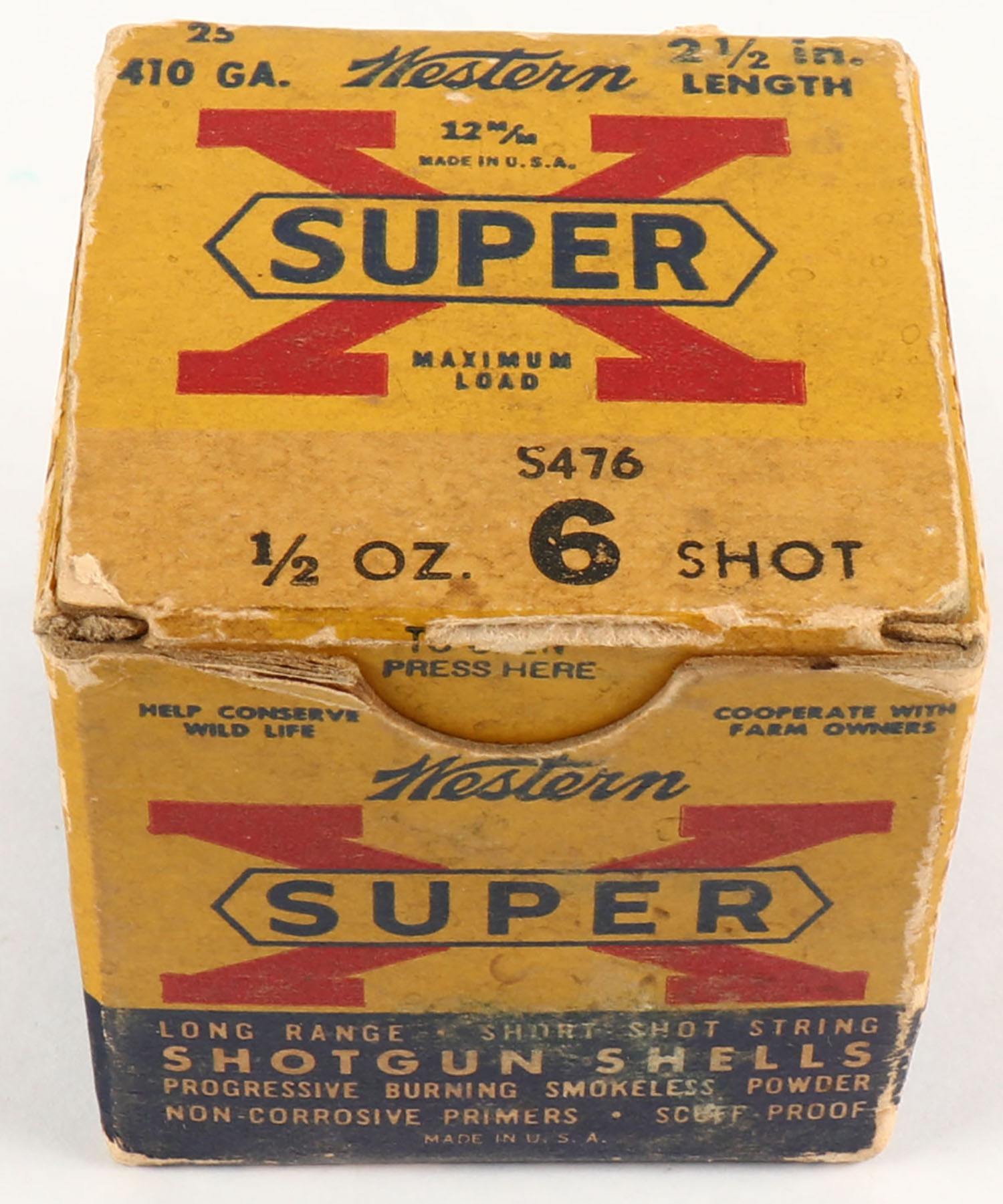 Western, Super X, 410ga., 1pc., Full, shot size 6, 2 1/2'', multi-colored box, box has age soiling, paper shells are good. Grade: Very Good - Value: 10 to 30