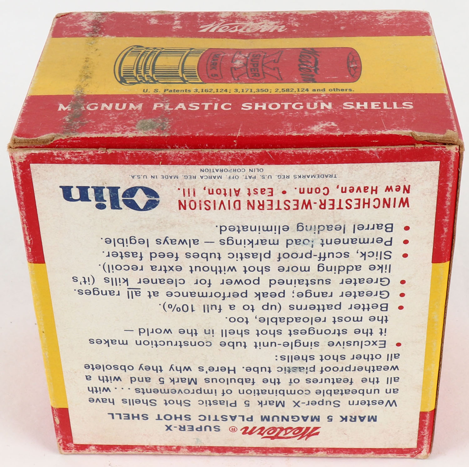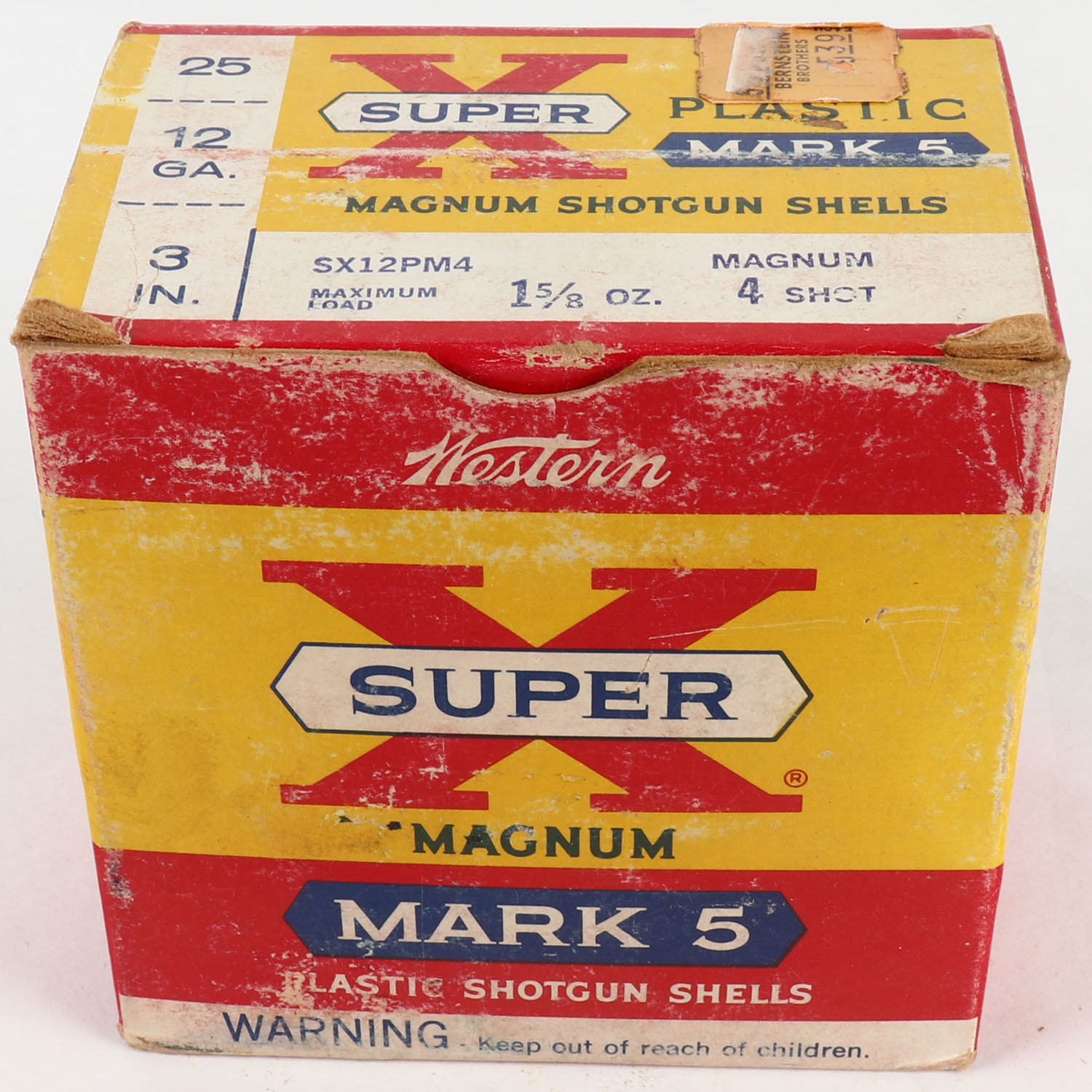 Western, Super X, Mark 5, 12ga., 3'', 1pc., Full, shot size 4 Magnum, multi-colored box, box has scuffing & light edge wear, box has very nice colors, plastic shells are excellent. Grade: Very Good ++ - Value: 10 to 30