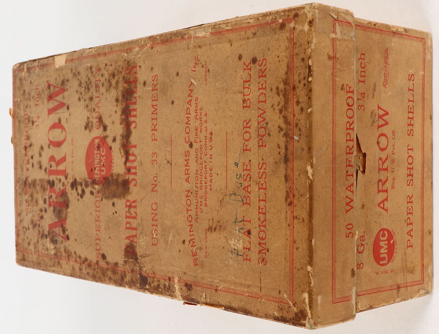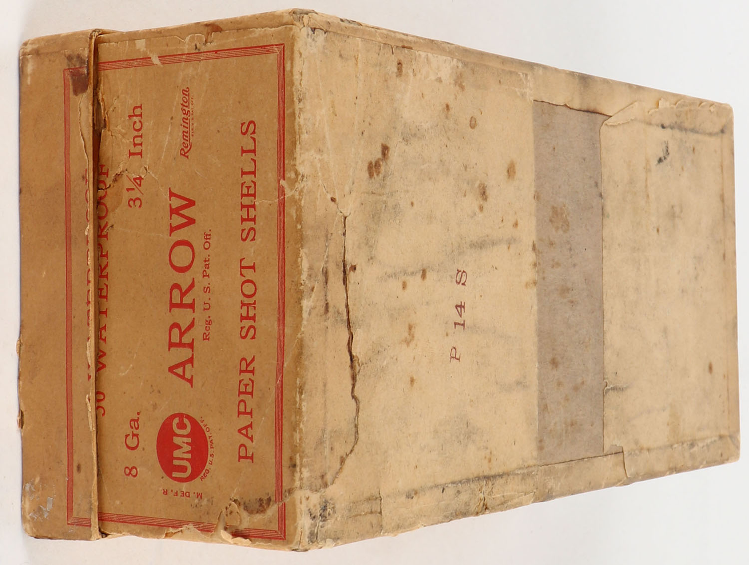 RARE SHOE BOX, Remington UMC, ARROW, 8ga., 2pc., Partial 49 rds., 4 Shot (full of NPE), 3 1/4 Inch., buff box with buff & red label, box has scuffing with some age soiling, paper shells are very good. Grade: Very Good ++ - Value: 700 to 2800