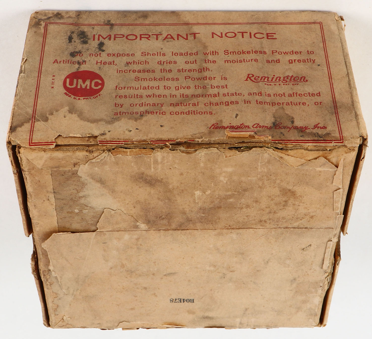 Remington, ARROW, 8ga., 2pc., Full, shot size 1C, buff box with buff & red label, box has age soiling with scuffing, paper shells are excellent. Grade: Very Good + - Value: 100 to 600