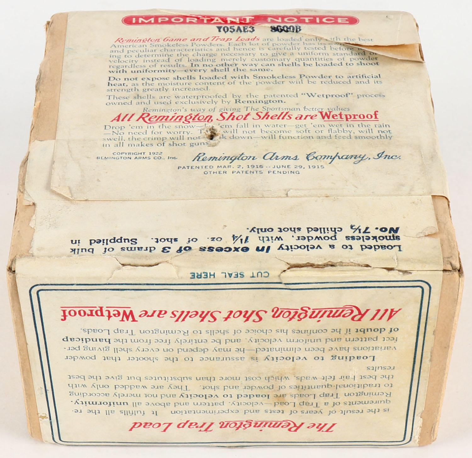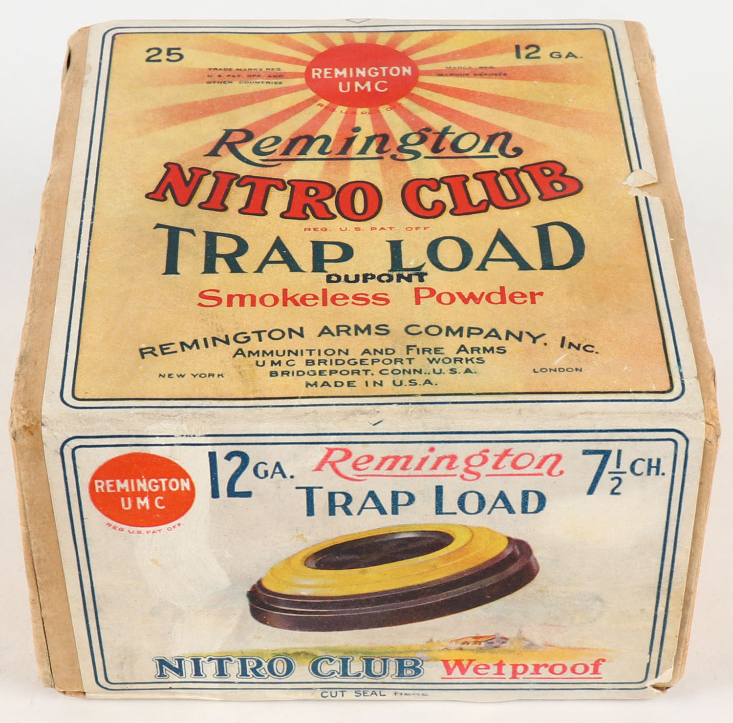 RARE Remington UMC Nitro Club, TRAP LOAD, 12ga., 2pc., FULL & SEALED, shot size 7 1/2 CH, buff box with sunburst logo & Clay Bird in flight on side, box has light shell protrusions & light scuffing with great colors, Hard to find box. Grade: Excellent - Value: 300 to 1000