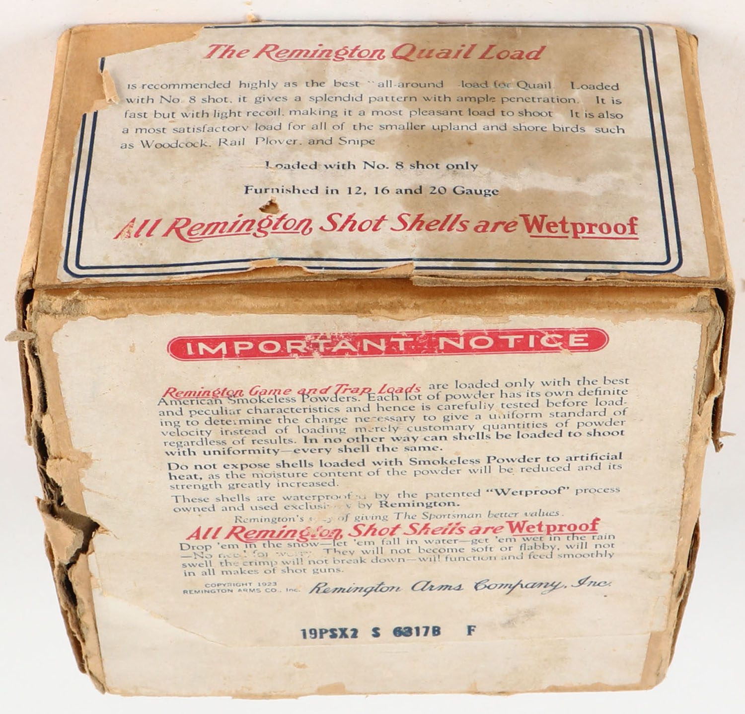 Remington UMC Nitro Club, GAME LOADS, QUAIL LOAD, 12ga., 2pc., Partial 21rds., shot size 8 CH, buff box with sunburst logo & QUAIL in flight on side, box has age soiling with edge wear, box has a seam split, paper shells are very good. Grade: Very Good - Value: 100 to 600