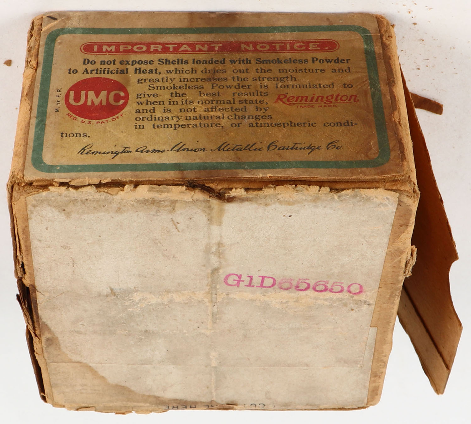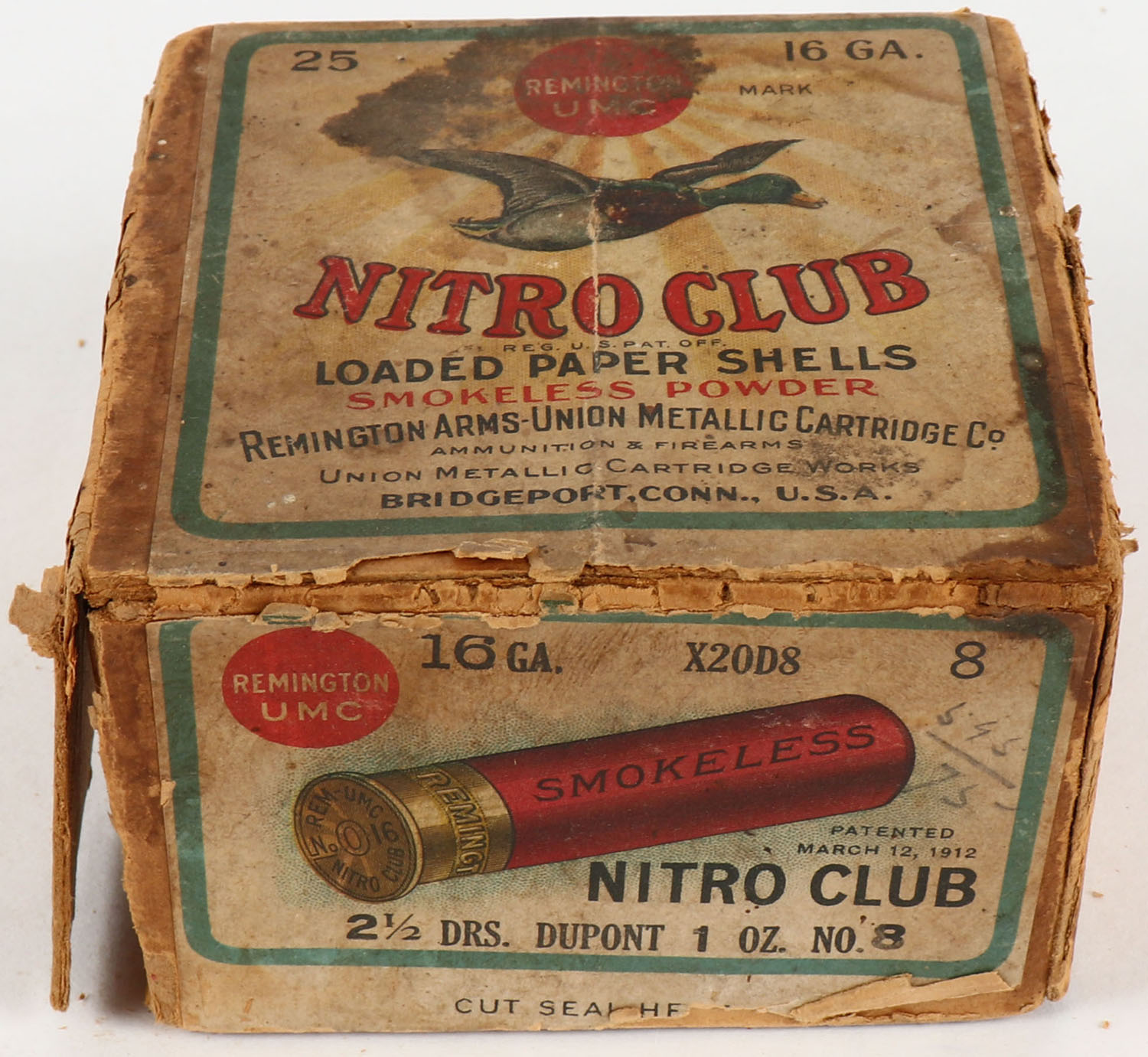 Remington UMC, Nitro Club, 16ga., 2pc., Full, Loading: 2 1/2 DRS. DuPont 1 Oz., No. 8, buff box with sunburst logo & Mallard flying on top, box has seam splits with soiling and scuffing, paper shells are excellent. Grade: Good + - Value: 40 to 300