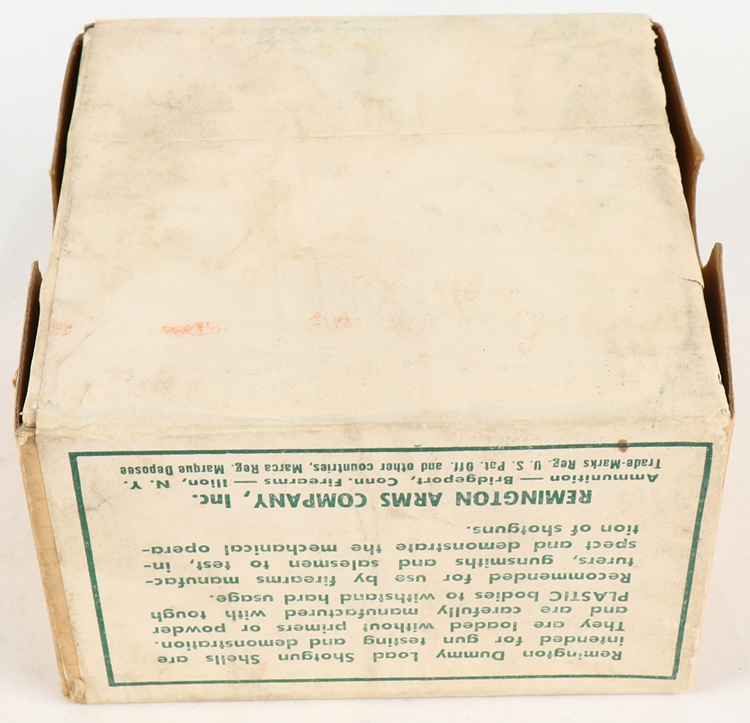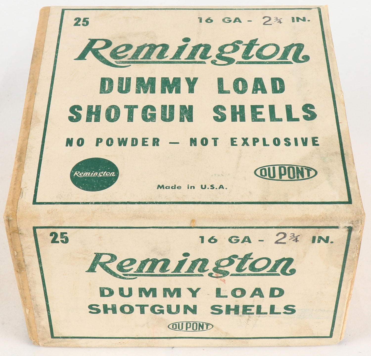 Remington Dummy Load Shotgun Shells, NO Powder Not Explosive, 16ga., 2 3/4'', 2pc., FULL & SEALED, Buff box with white & green label. Box has light scuffing. Grade: Excellent + - Value: 20 to 60