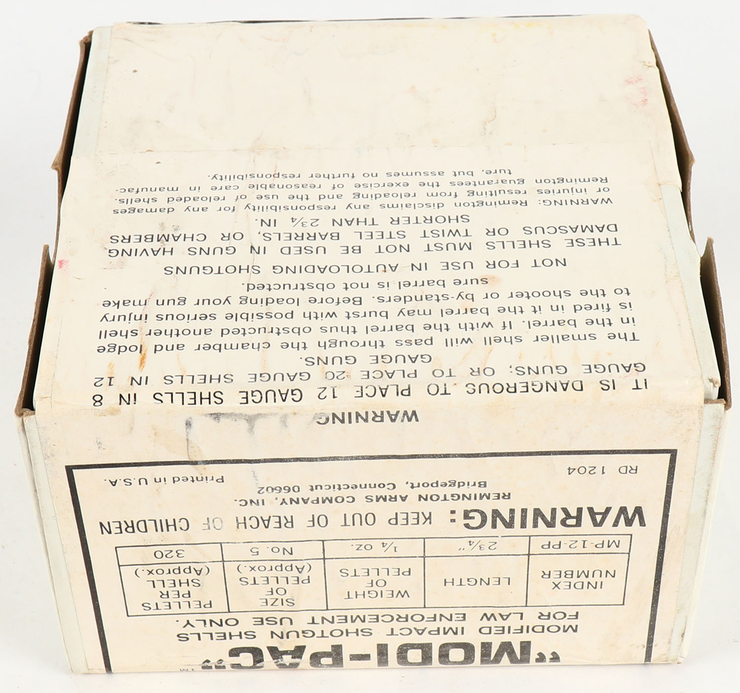 Remington, ''MODI-PAC'', Plastic shotgun shells, 12ga., 2pc., FULL & SEALED, White box with white and black label, box & label are nice with minor scuffing. Grade: Excellent - Value: 20 to 60