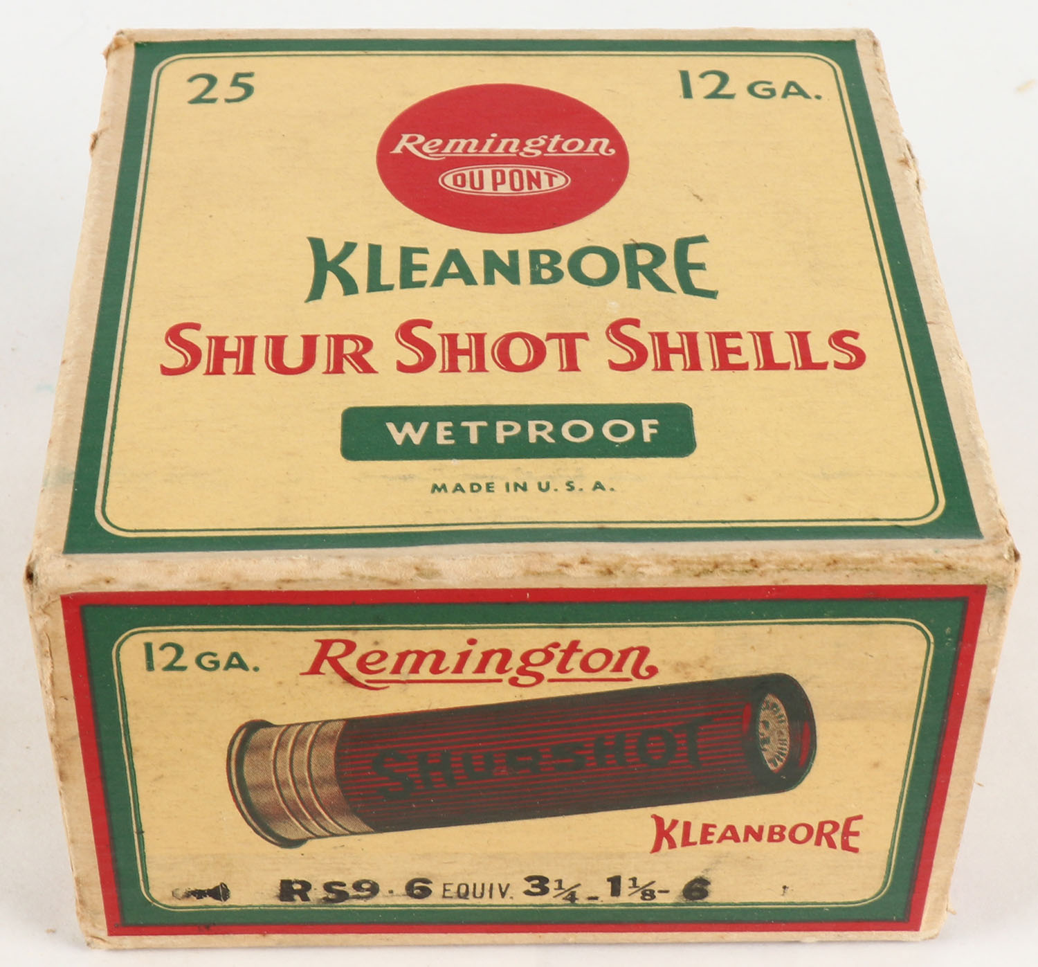 Remington Kleanbore, SHUR SHOT SHELLS, 12ga., 1pc., Full, shot size 6 , box is yellow, red and green, box has light scuffing with great colors, paper shells are excellent. Grade: Excellent - Value: 10 to 50