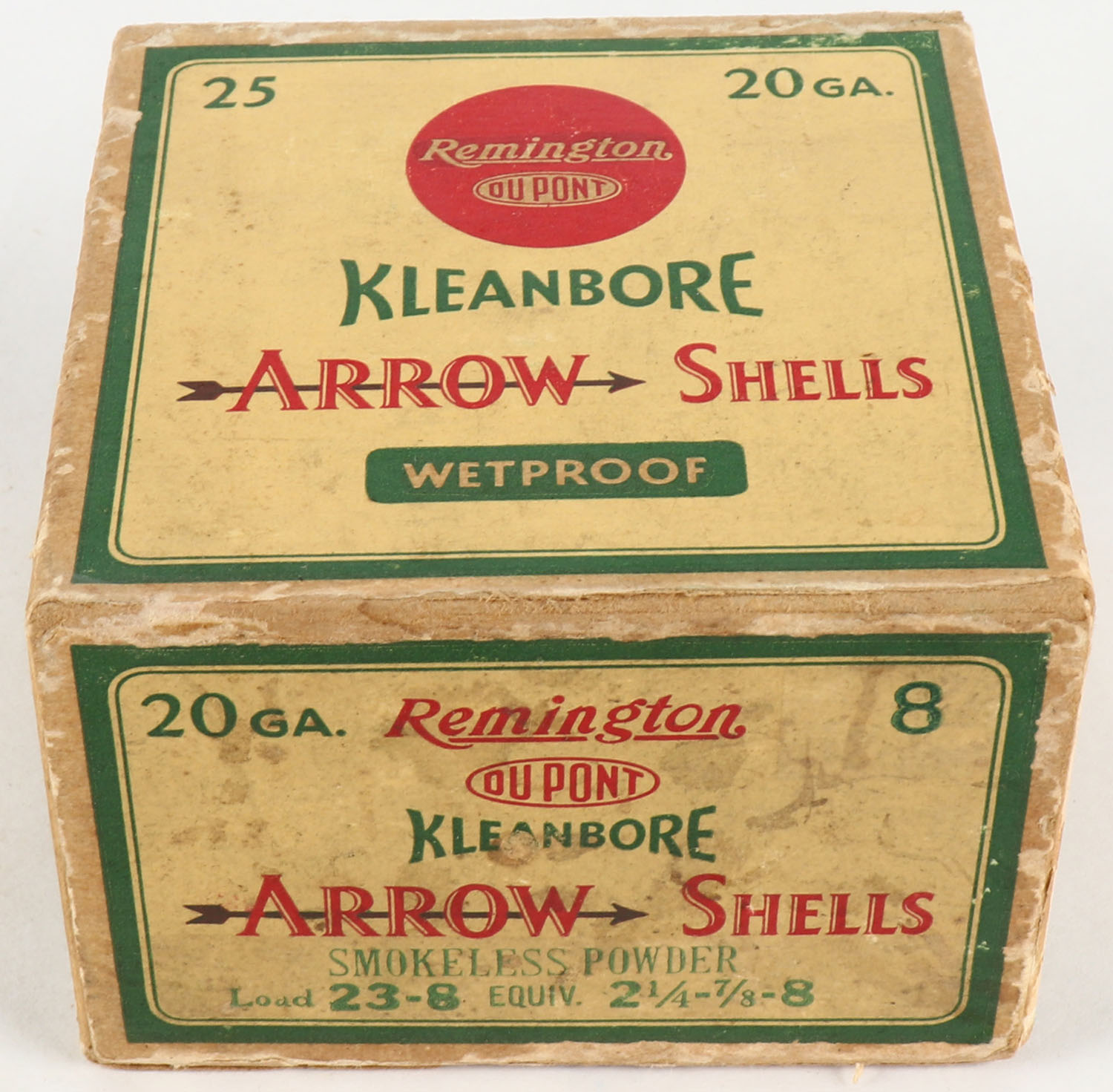 Remington, Kleanbore, ARROW Shells, 20ga., 1pc., 2 1/4'', Full, shot size 8, box is yellow, red and green, box has scuffing with edge wear, paper shells are very good. Grade: Very Good - Value: 10 to 60