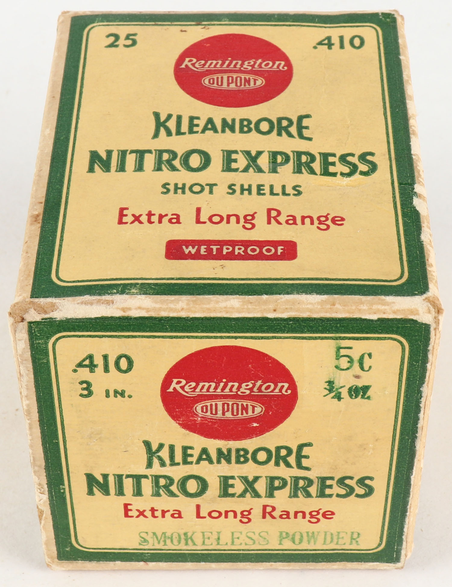 Remington, Kleanbore, NITRO EXPRESS, 410ga., 1pc., Full, shot size 5C, 3'', box is yellow, red and green, box has some edge wear, paper shells are good. Grade: Very Good - Value: 20 to 60