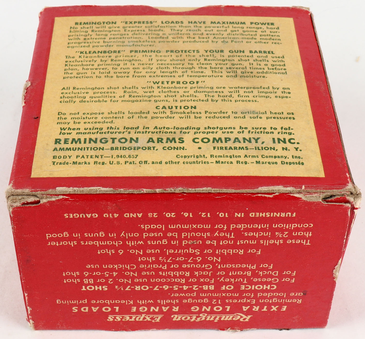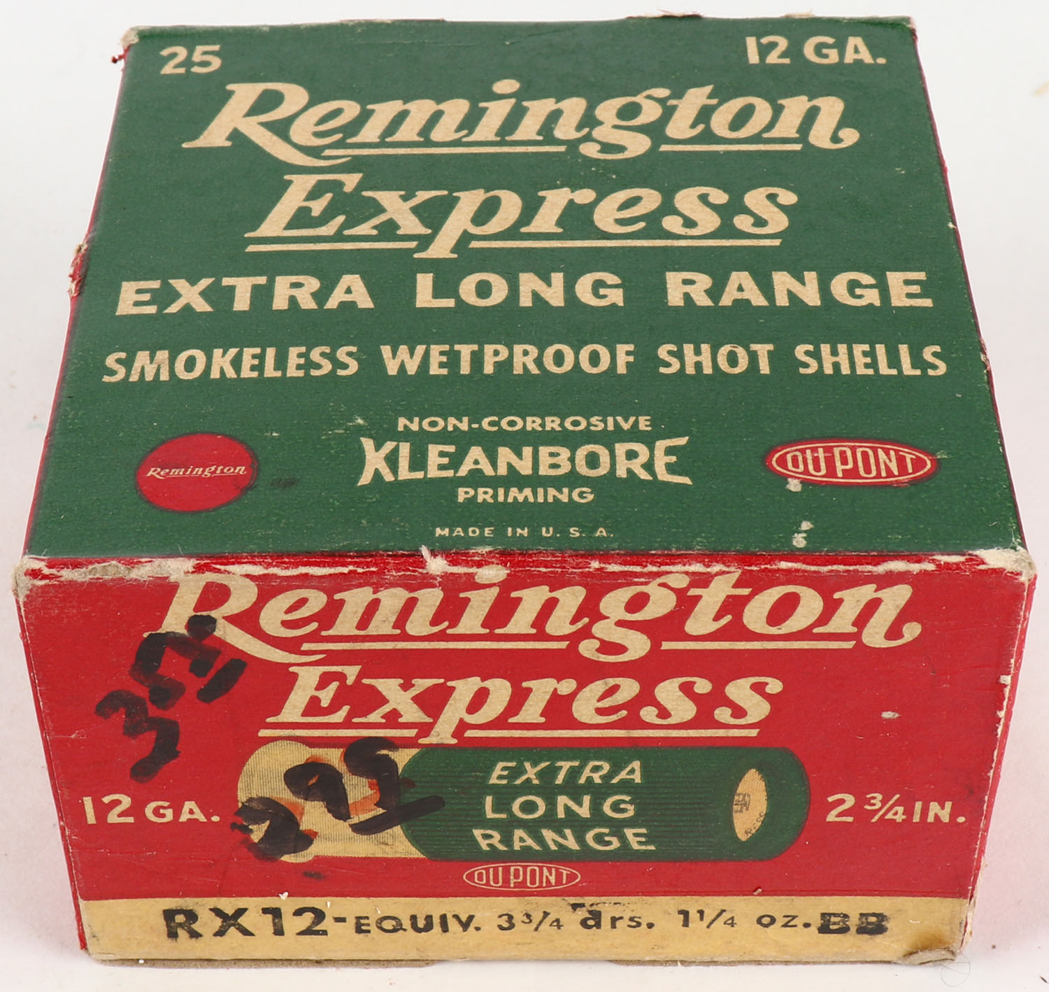 Remington Express, Extra Long Range, 12ga., 2 3/4'', 1pc., Full, shot size BB, box is red, white and green, box has corner wear, paper shells are excellent. Grade: Very Good ++ - Value: 10 to 30