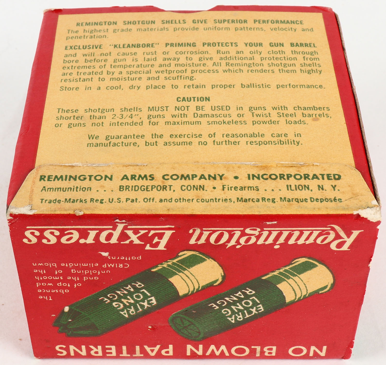 Remington Express, Extra Long Range, 16ga., 2 3/4'', 1pc., Full, shot size 6, box is red, green, and yellow, box is minty, shells are very good. Grade: Excellent + - Value: 10 to 30