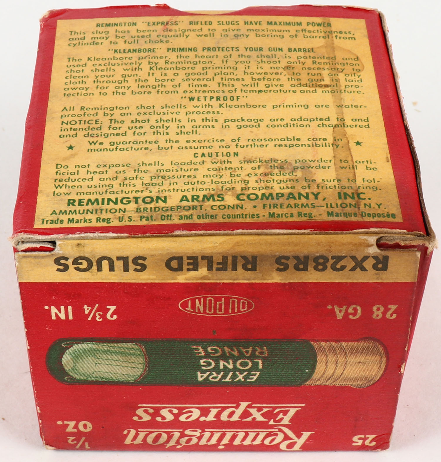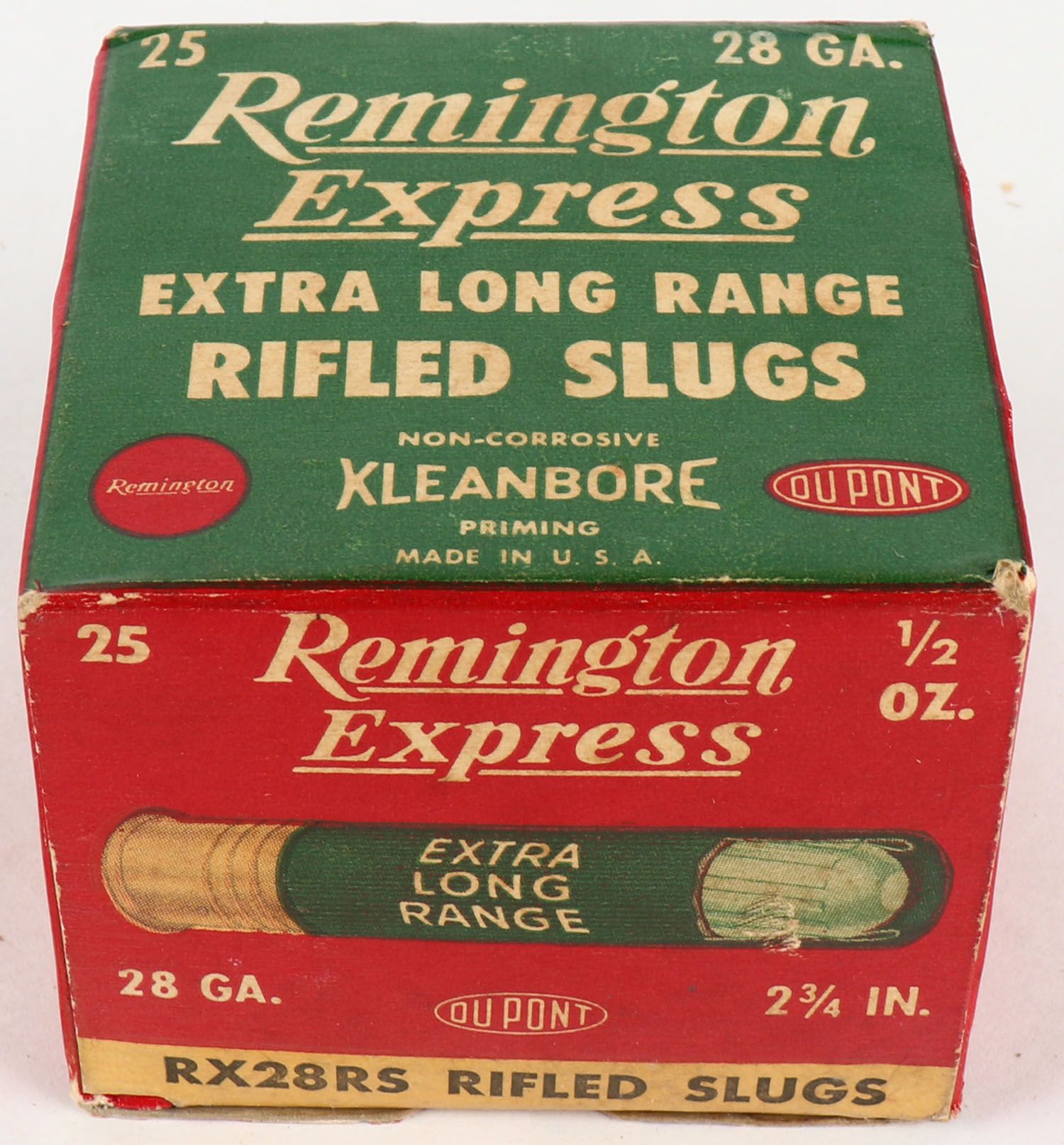 Remington Express, Extra Long Range, 28ga., 2 3/4'', 1pc., Full, shot size Rifled Slugs, box is white, yellow, red and green, box is very solid with minor scuffing, paper shells are very good. Grade: Excellent - Value: 10 to 40