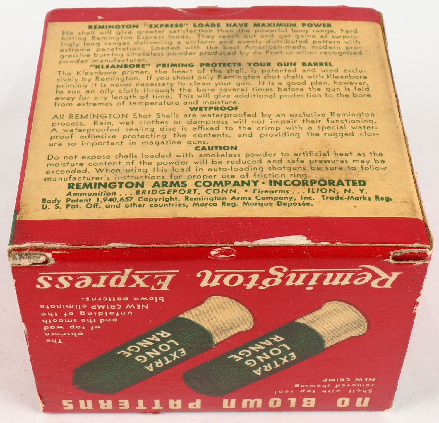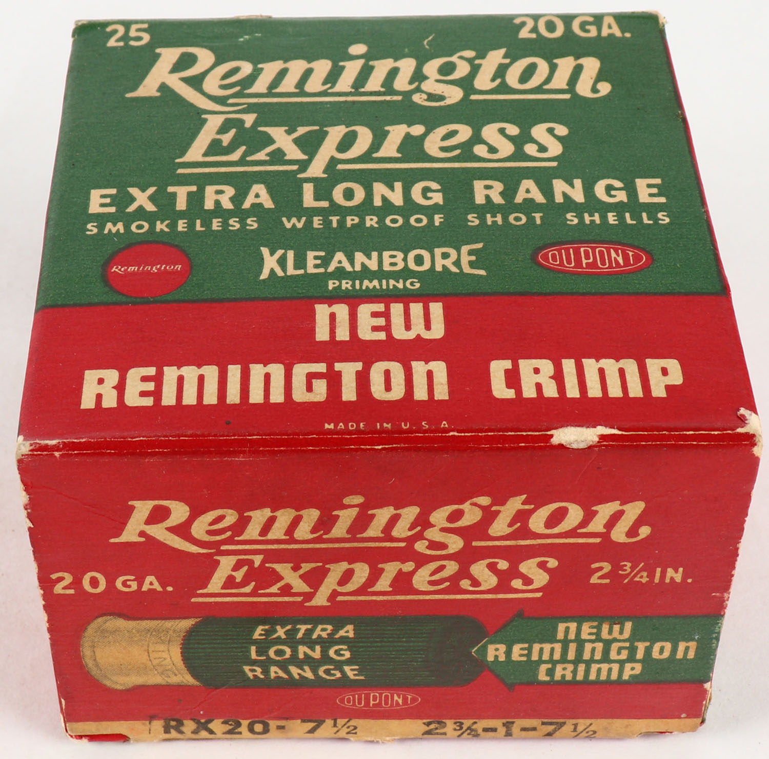 Remington, Express, Extra Long Range, 20ga., 2 3/4'', 1pc., Full, shot size 7 1/2, box is red, white and green, box is very solid, paper shells are excellent. Grade: Excellent ++ - Value: 10 to 40