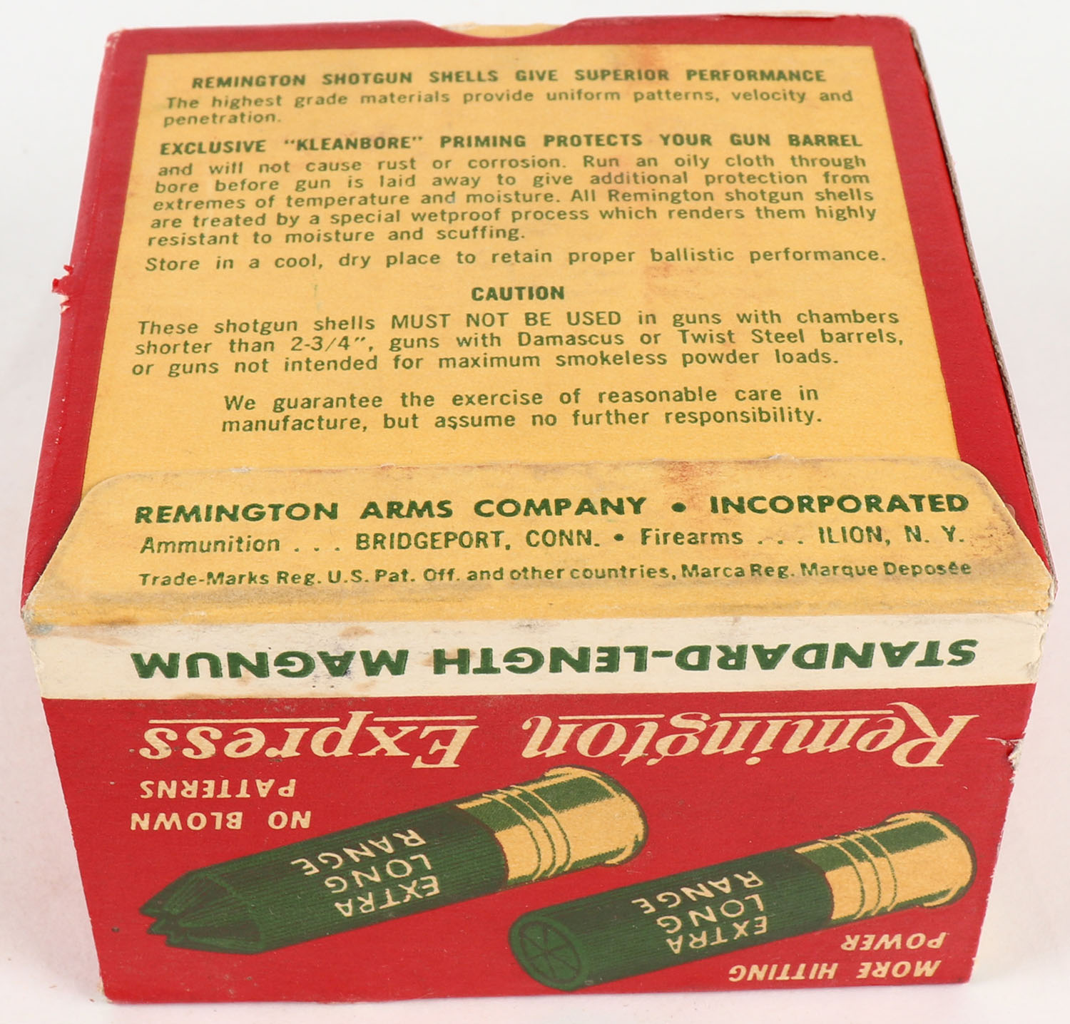 Remington Express, Standard Length Magnum, 16ga., 2 3/4'', 1pc., Full, shot size 6, box is red, white and green, box is very solid with great colors, plastic shells are excellent. Grade: Excellent + - Value: 10 to 40