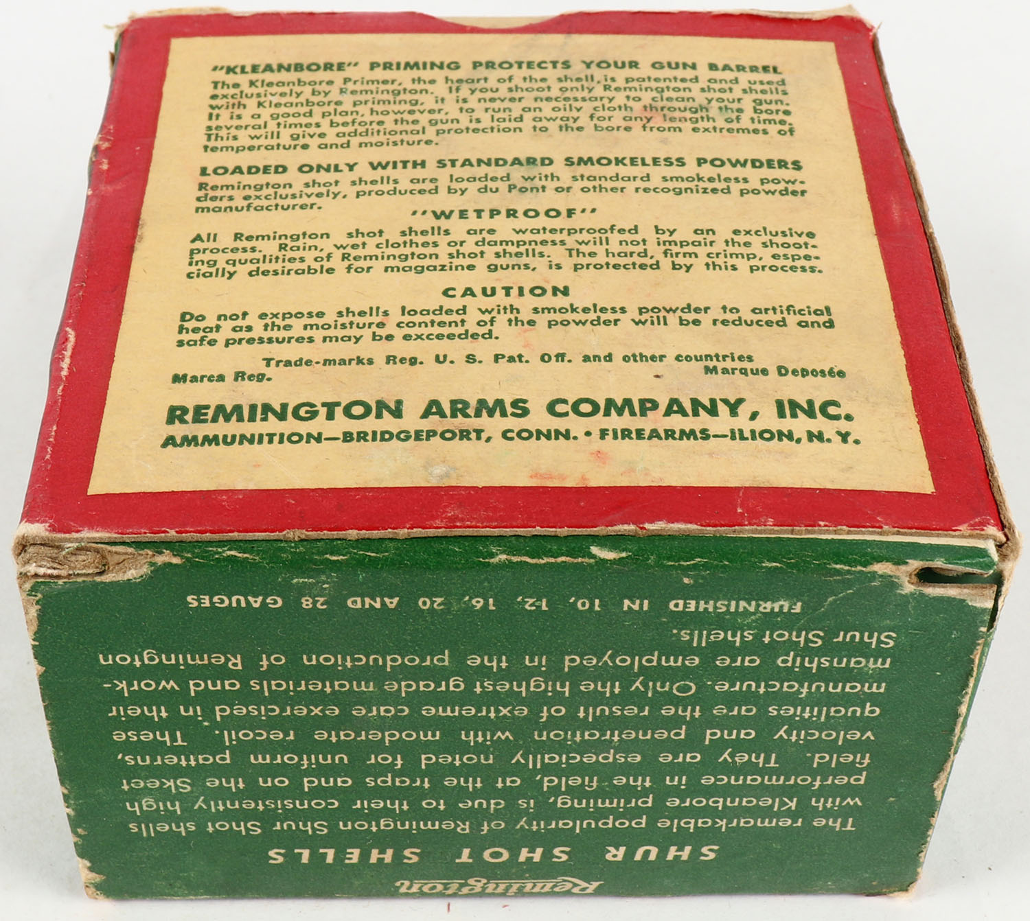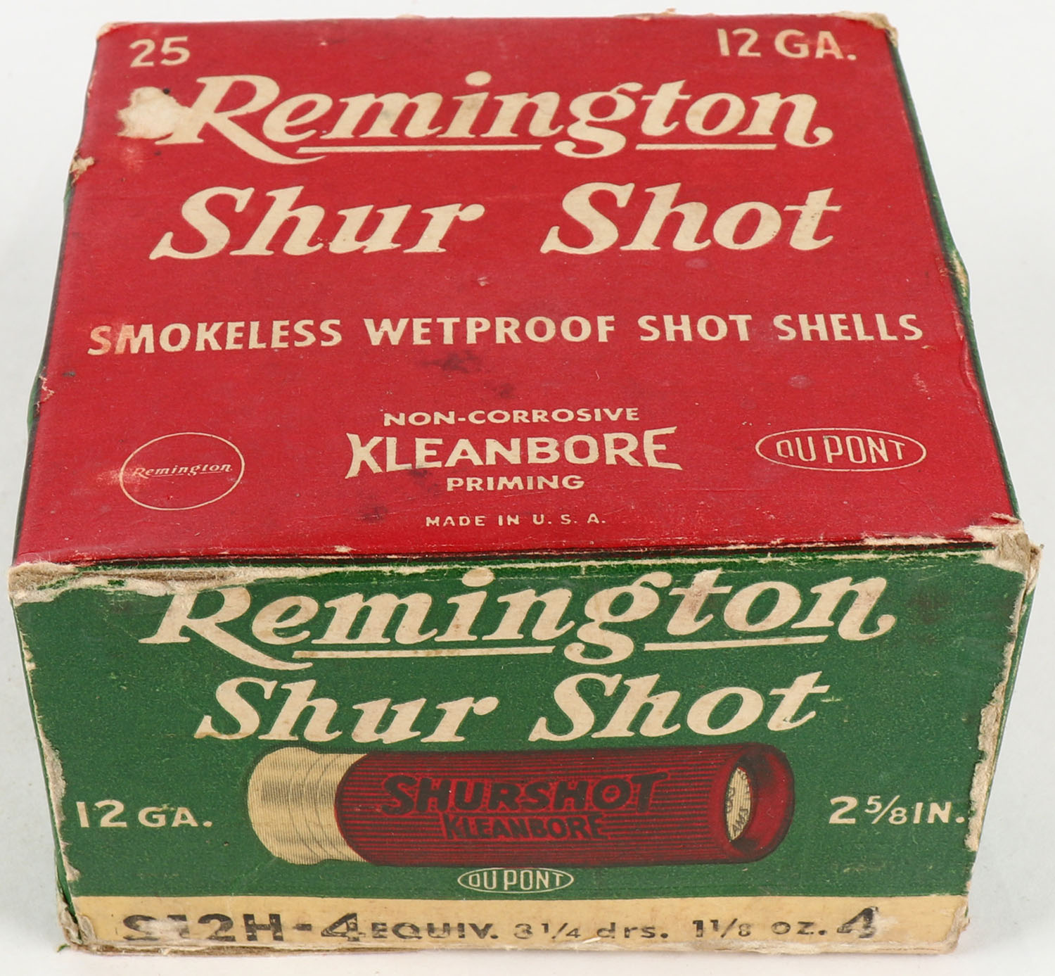 Remington Shur Shot, 12ga., 2 5/8'', 1pc., Full, shot size 4, box is white, yellow, red and green, box has light edge wear with scuffing, paper shells are excellent. Grade: Very Good ++ - Value: 10 to 40