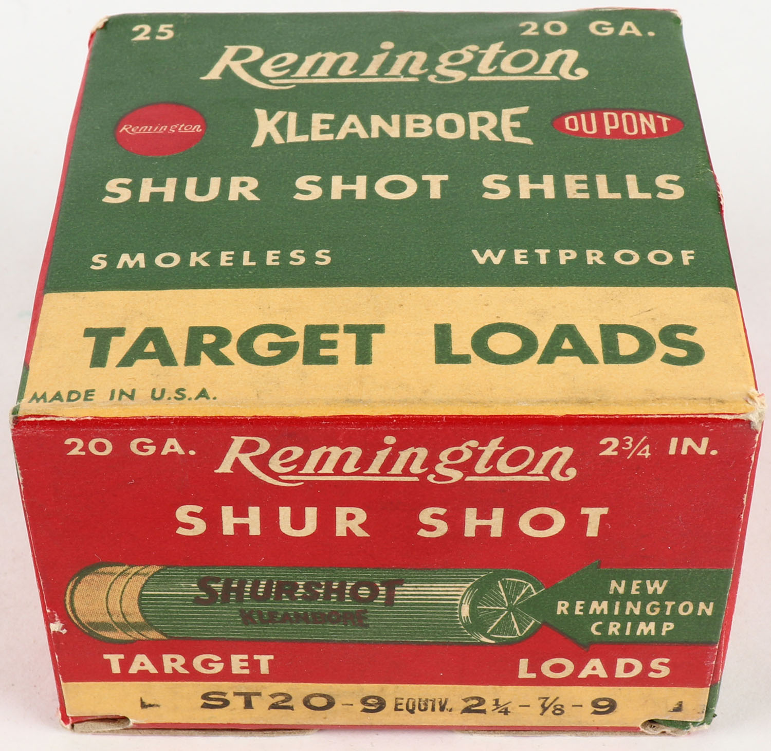 Remington Shur Shot Shells, Target Loads, 20ga., 1pc., Full, shot size 9, red and green box, 2 3/4'', box is very solid, paper shells are excellent. Grade: Excellent ++ - Value: 10 to 30