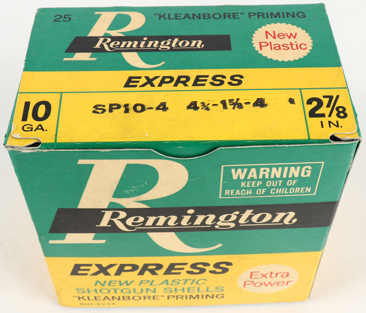 Remington, Express, 10ga., 2 7/8'', 1pc., Full, shot size 4, multi-colored box, box is very solid with great colors, plastic shells are excellent. Grade: Excellent ++ - Value: 20 to 100