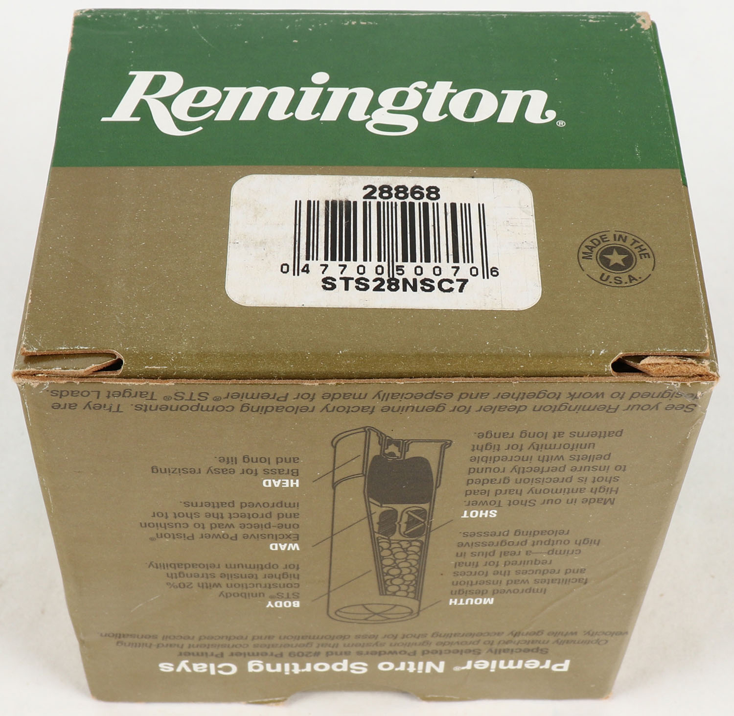 Remington, Premier Nitro Sporting Clays, 28ga., 2 3/4'', 1pc., Full, shot size 7 1/2, multi-colored box, box is very solid with great colors, plastic shells are excellent. Grade: Excellent ++ - Value: 10 to 40