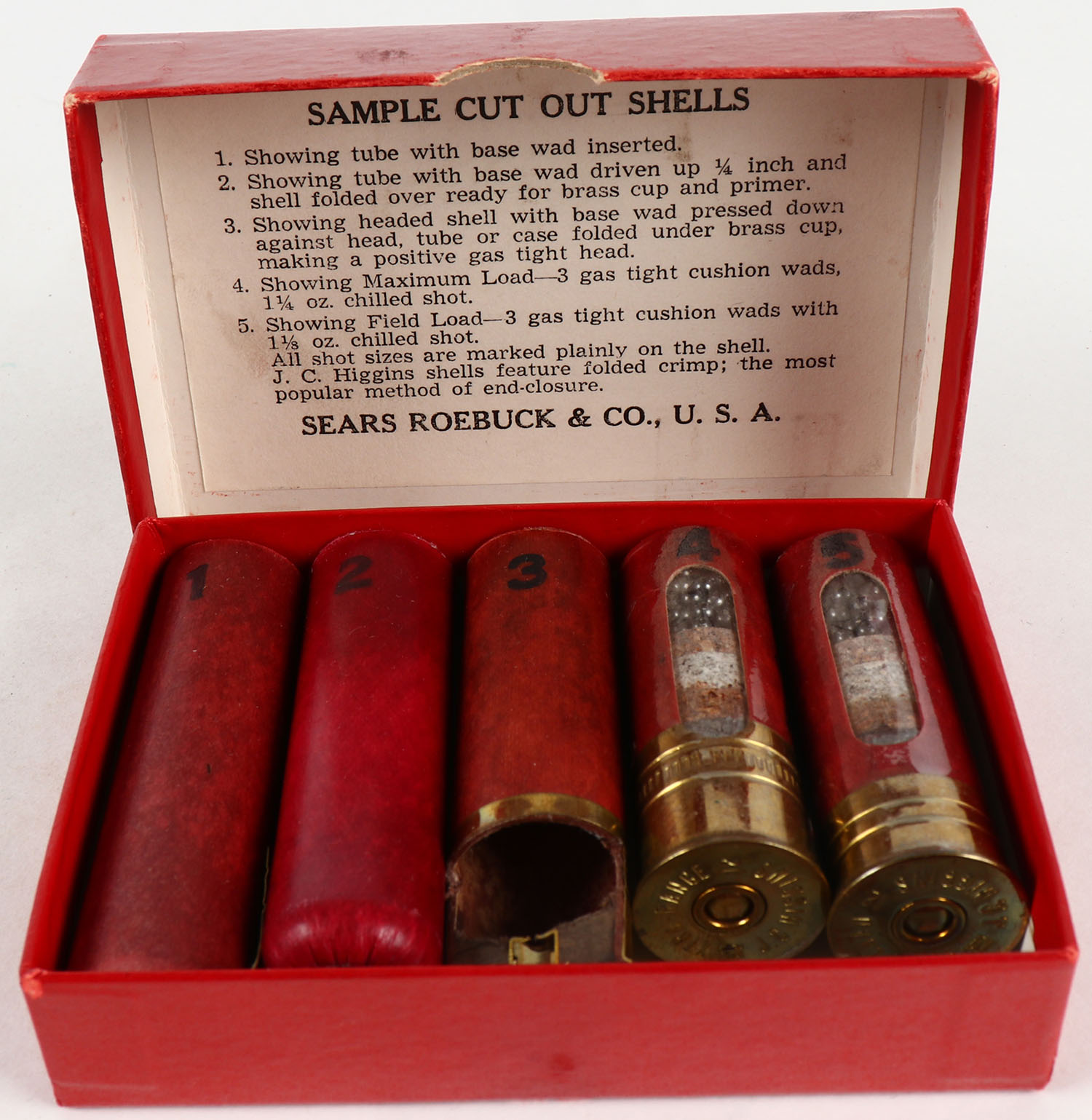 Sears Roebuck & Co Salesman Sample Set, red box is solid with red & black top label that says Sample Shells, shells are excellent, Rare & hard to find. Grade: Very Good ++ - Value: 50 to 200