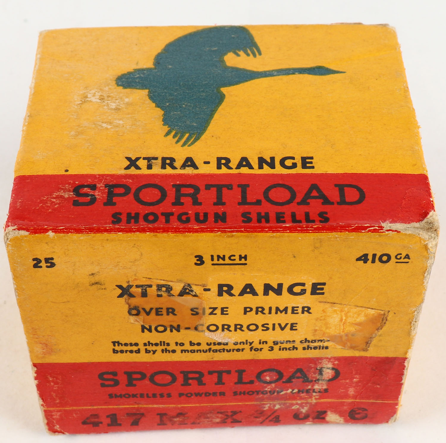 Sears Roebuck & Co., Sportload XTRA-RANGE, 410ga., 1pc., Full, 3'', shot size 6, yellow, blue & red box that pictures a Goose in flight, box has light age soiling & scuffing, paper shells are very good. Grade: Very Good - Value: 20 to 100