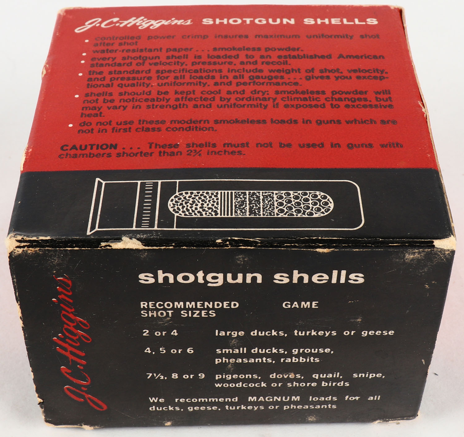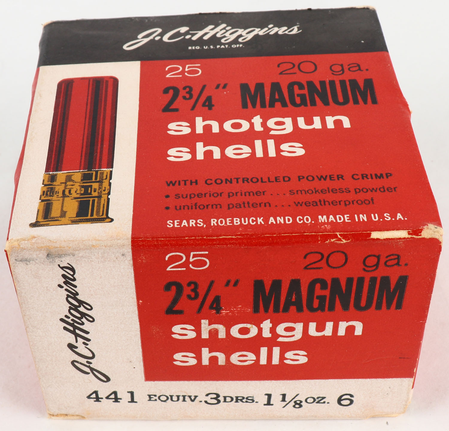 Sears, J.C. Higgins, 20ga., 1pc., 2 3/4'' Magnum, Full, shot size 6, multi-color box, box is solid, paper shells are very good. Grade: Very Good ++ - Value: 10 to 40
