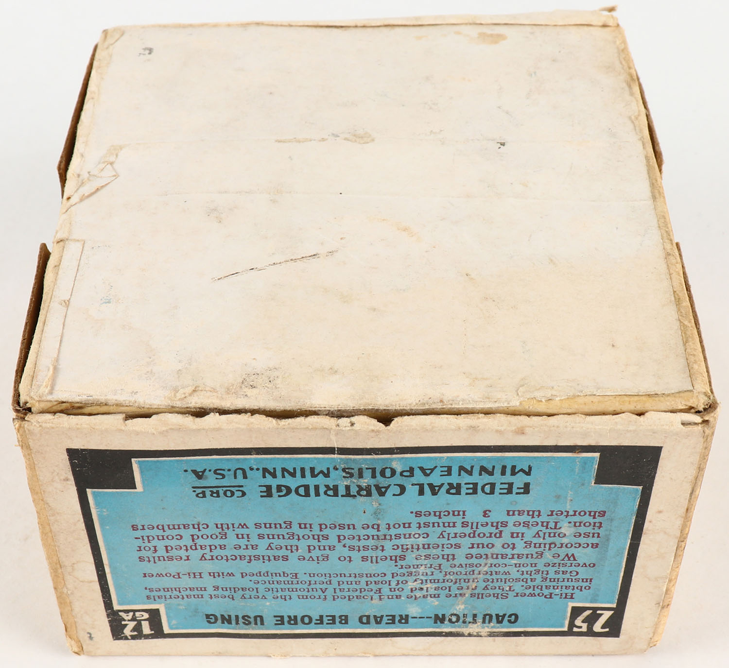 Federal Cart. Co., HI-POWER, 12ga., 2 PIECE!, Empty, shot size 4, buff box with multi colored label that pictures Mallard in flight, box has scuffing, light edge wear & light soiling with very nice label. Grade: Very Good ++ - Value: 40 to 200