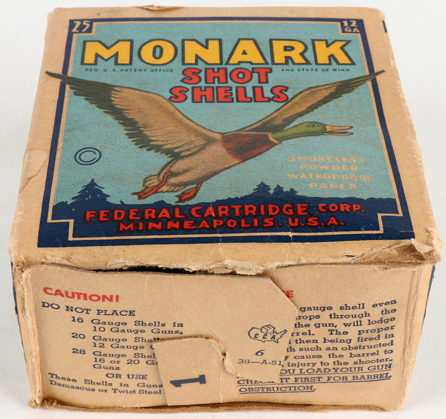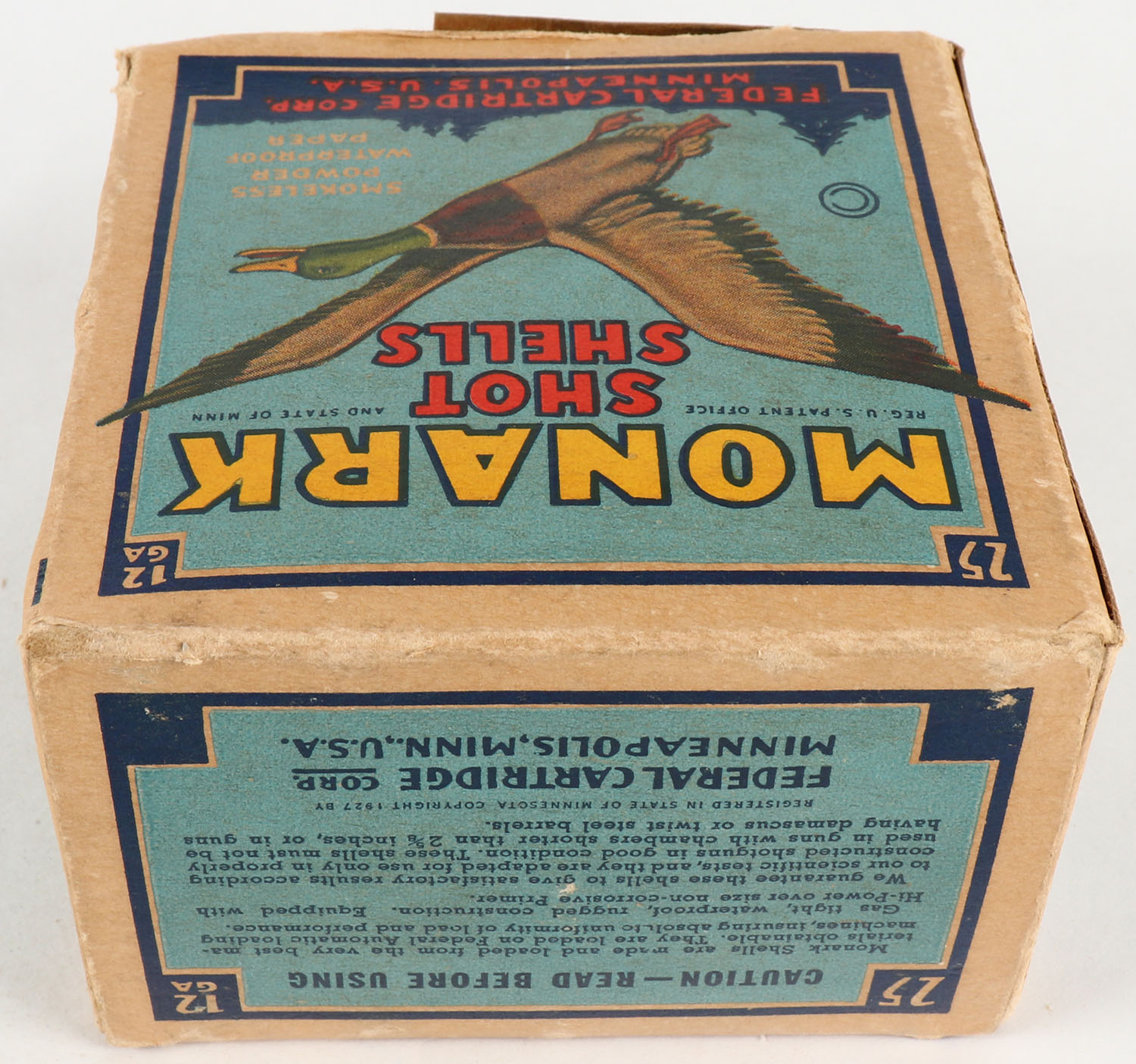Federal Cart. Co., MONARK, 12ga., 1pc., Partial 24rds., shot size 9 Skeet Load, Blue border, blue, yellow and red box with flying mallard, box has age soiling with a missing bottom flap, paper shells are excellent. Grade: Very Good - Value: 10 to 40