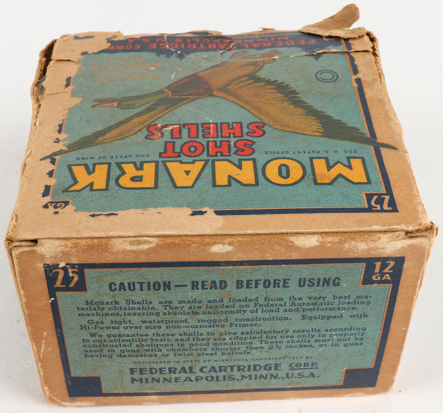 Federal Cart. Co., MONARK, 12ga., 1pc., Full, shot size 9 Skeet Load, Blue border, blue, yellow and red box with flying mallard, box has age soiling with a missing bottom flap, paper shells are excellent. Grade: Good - Value: 10 to 40