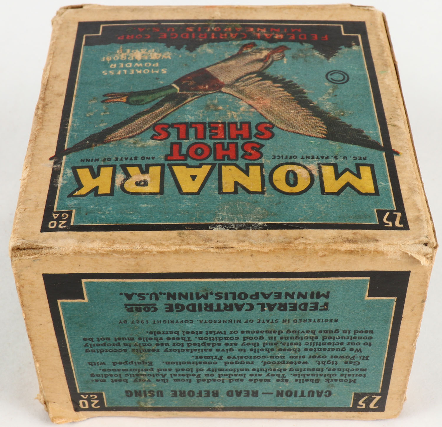 Federal Cart. Co., MONARK, 20ga., 1pc., Full, shot size 6CH, Black border, blue, yellow and red box with flying mallard, box has age soiling, paper shells are excellent. Grade: Very Good + - Value: 10 to 40