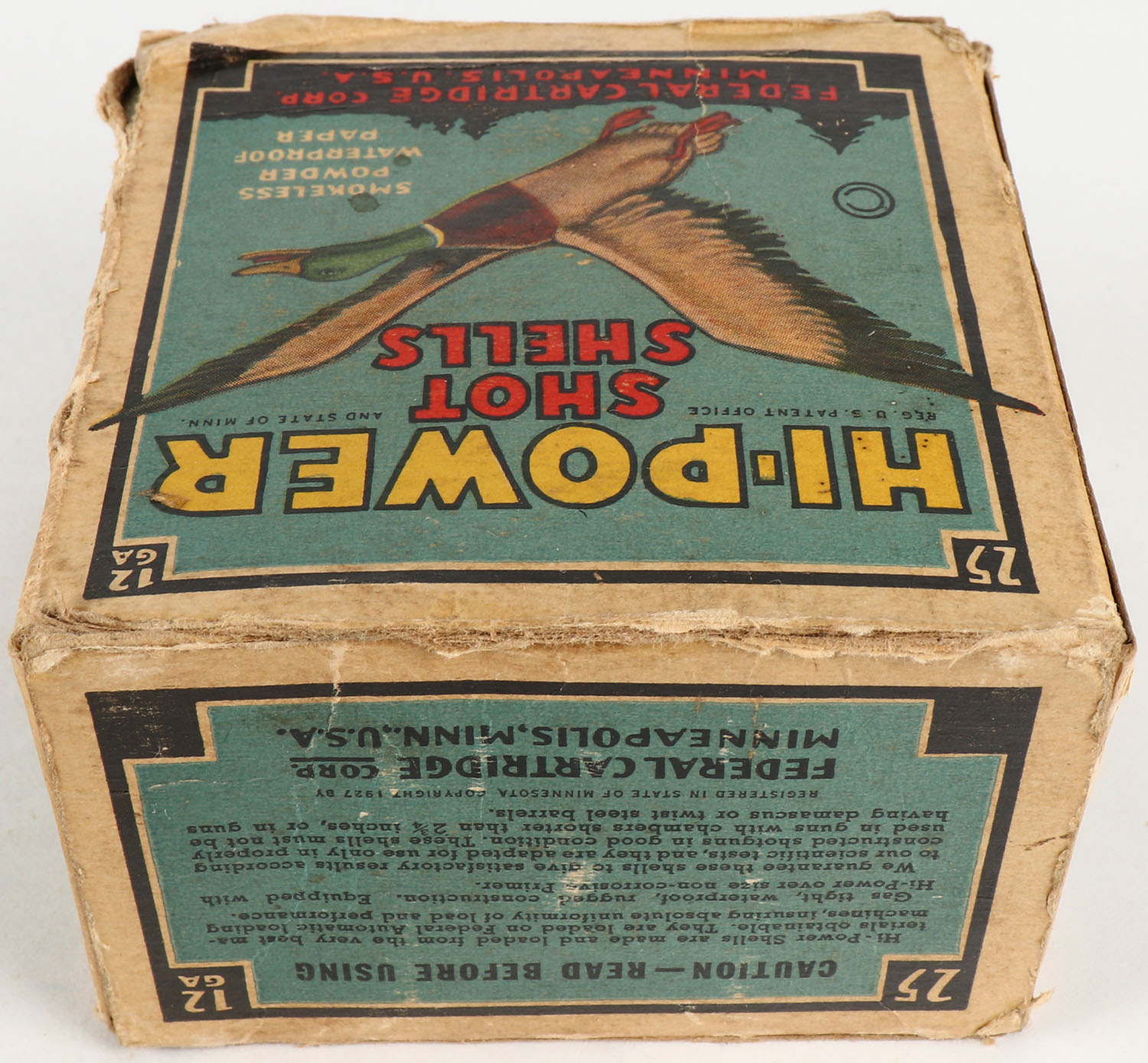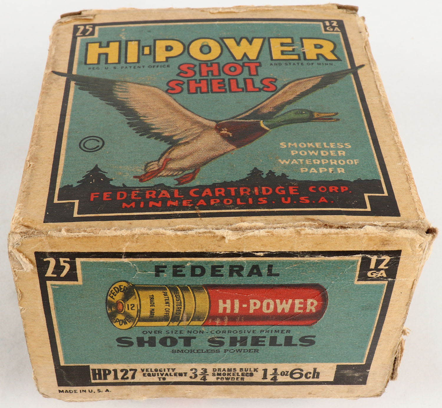 Federal Cart. Co., HI-POWER, 12ga., 1pc., Full, shot size 6 ch, Black border, blue, yellow and red box with flying mallard, box has age soiling with torn end flaps, paper shells are very good. Grade: Good + - Value: 10 to 40